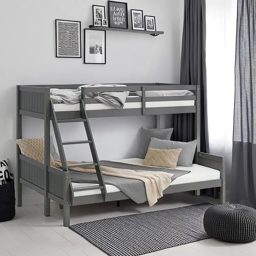 Ein stabiles Etagenbett für Kinder mit zwei Liegeflächen. Ein standfestes Doppelstockbett aus echtem Holz. Die obere Liegefläche misst 90×200 und die untere breitere Liegefläche misst 140×200. Robust und stilvoll für Ihr Kinderzimmer. Farblich in edlem Grau.