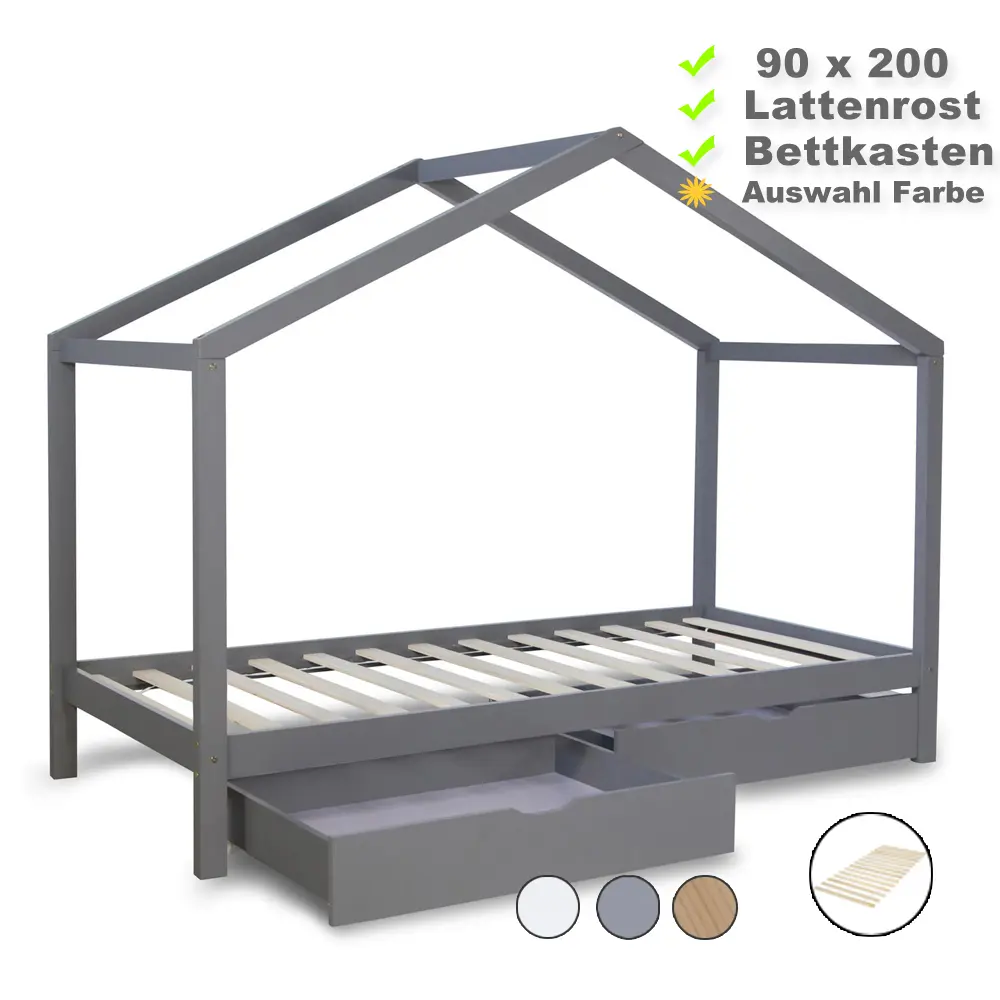 Hausbett 90×200 – Kinderbett mit Bettkästen – Farbe-Auswahl: Natur Weiß Grau