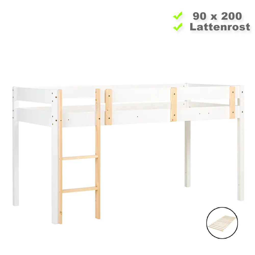 Das Bettgestell ist weiß lackiert, wobei Leiter und einzelne Holzbalken in Naturfarbe mit sichtbarer Holzmaserung hervorstechen. Die Lieferung erfolgt inklusive Lattenrollrost, um Ihrem Kind höchsten Schlafkomfort zu bieten braucht es nur noch eine Matratze.