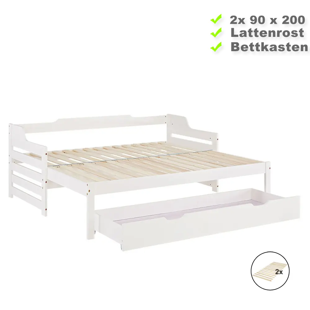 Ausziehbett 2x 90×200 – Einzelbett und Doppelbett aus Holz mit Bettschublade – Farbe: Weiß