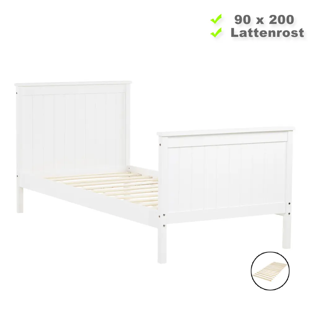 Einzelbett 90×200 – Holz Kinder- und Jugendbett mit hohem Kopf und Fußrahmen – Farbe: Weiß