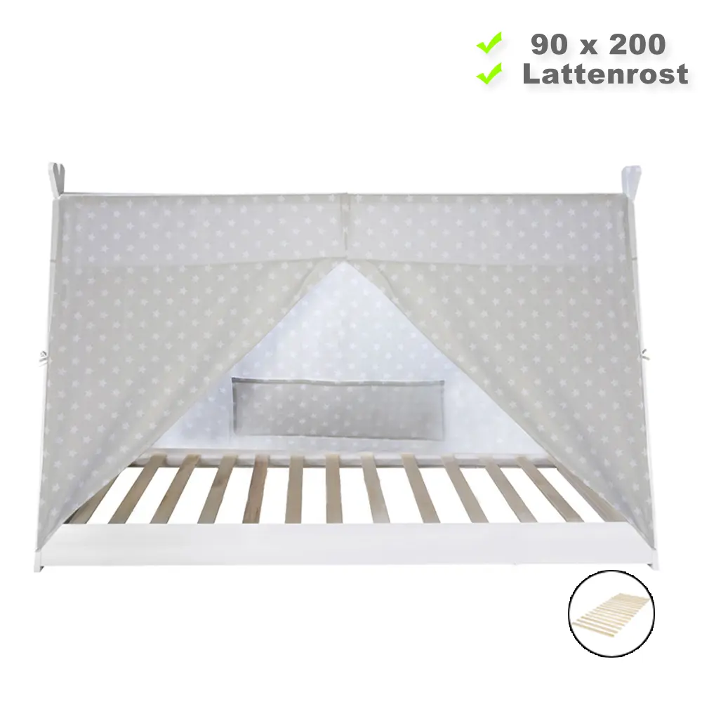 Tipi 90×200 cm – bodentiefes Holzbett in Zeltform für Kinder – Farbe: Weiß Grau