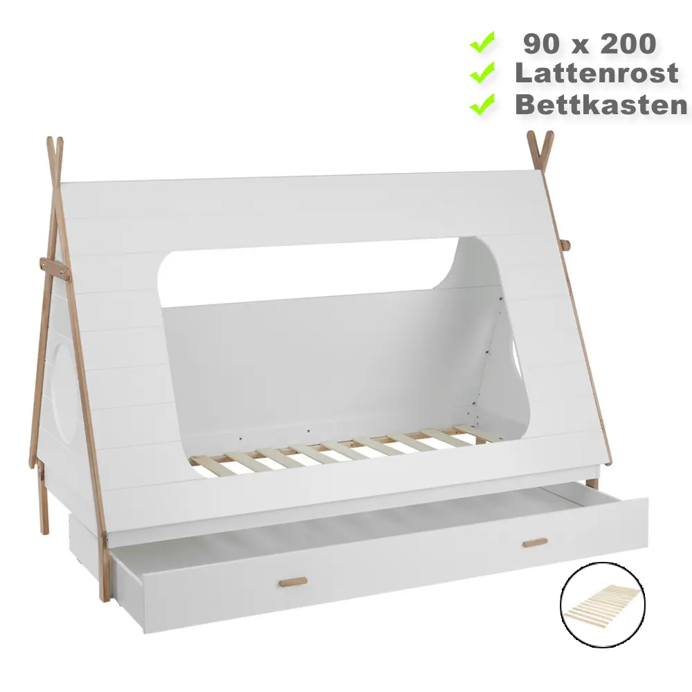 Tipi 90×200 cm – Hausbett für Kinder mit Bettkasten und Sichtfenster