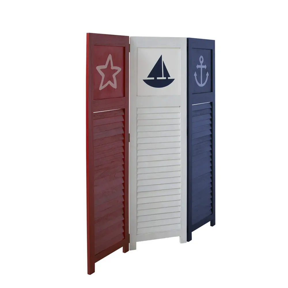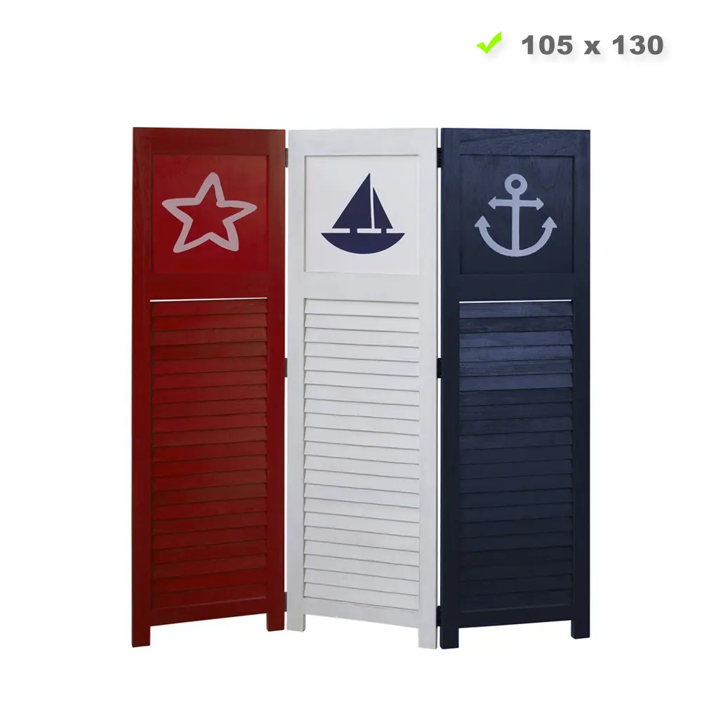 Mehrfarbiger schöner Raumteiler mit maritimen See-Motiven 105×130 cm – ein Paravent 3 teilig aus Holz mit diagonal verlaufenen Holzlamellen im Used-Look. Farblich verschieden farbig, Rot, Weiß, Blau.