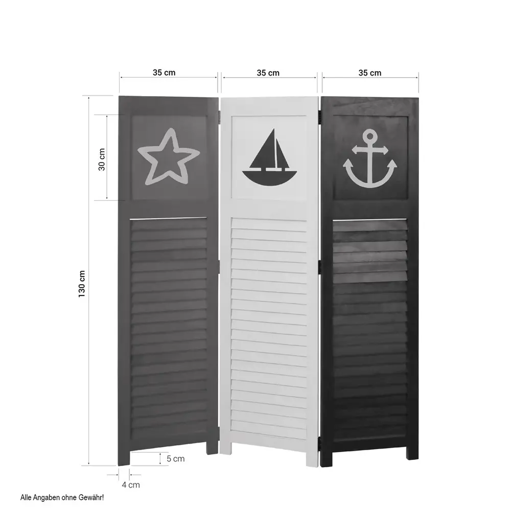 Neben seinem ansprechenden Design bietet der Paravent auch praktische Vorteile: Er dient als mobiler Sichtschutz oder Raumtrenner und sorgt für eine angenehme Atmosphäre. Der Paravent mit einer Breite von 105 cm besteht aus drei beweglichen Elementen, die mit maritimen Motiven und Applikationen versehen sind. Jedes Einzelelement hat eine Breite von 35 cm. Er eignet sich ausschließlich für den Innenbereich. Durch das faltbare System und sein leichtes Gewicht lässt sich die Trennwand im Handumdrehen aufstellen und ebenso schnell wieder platzsparend zusammenklappen.