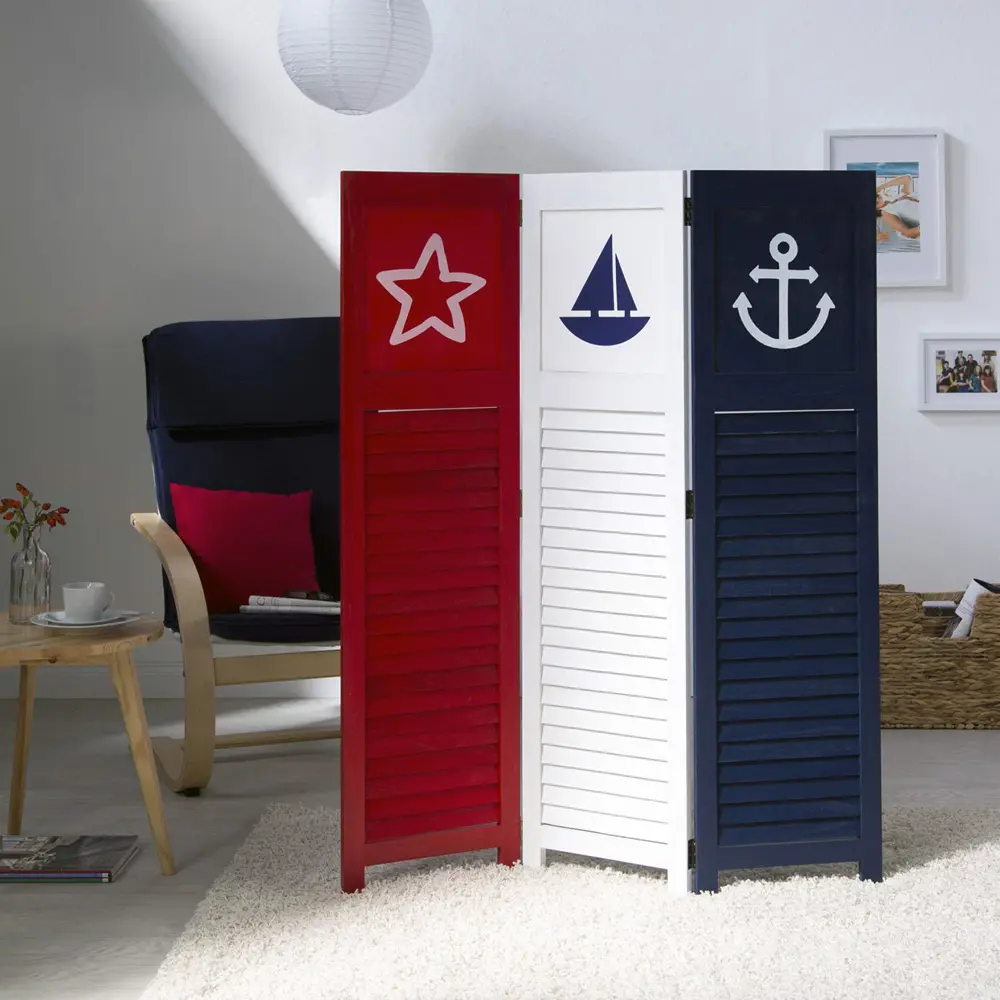 Der 3-teilige Raumteiler überzeugt durch seine farbenfrohe Gestaltung in den klassischen maritimen Tönen Rot, Weiß und Blau. Der hölzerne Rahmen wurde im Used-Look lackiert und mit charmanten Seemotiven versehen, die das mediterrane Ambiente unterstreichen. Die detailreichen Applikationen machen den Paravent zu einem dekorativen Blickfang in jedem Wohnbereich. Ob als stilvoller Sichtschutz im Schlafzimmer, als elegante Raumgliederung im Wohnzimmer oder als dekoratives Element im Flur – dieser Paravent lässt sich vielseitig einsetzen und fügt sich dank seines mediterranen Looks harmonisch in verschiedene Einrichtungsstile ein.