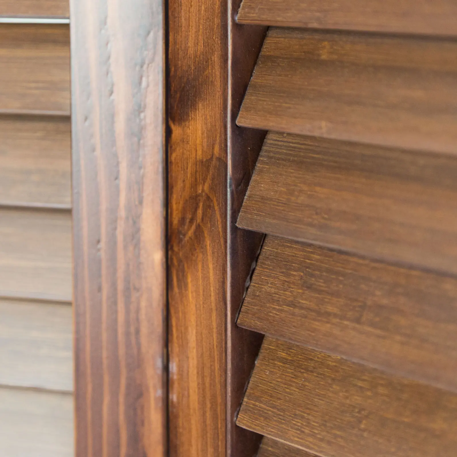 Besonderer Raumteiler aus Holz im edlen used Stil mit Maß 120×170 cm – ein hochwertiger Paravent 3 teilig mit mehrzeiligen Holzlamellen und im unteren Bereich einer Fläche. Farblich in mehrfarbigen Brauntönen, in einer washed Used Optik mit deutlich sichtbarer Maserung.
