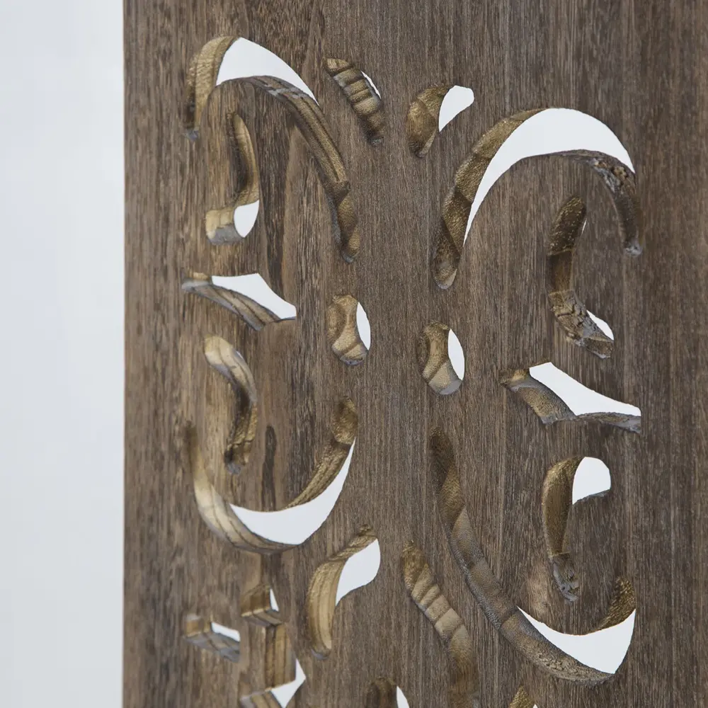 Der Rahmen des Paravents besteht aus massivem Paulownia-Holz und ist in einem washed Braun gehalten. Durch die bewusst gewählte Used-Optik entsteht ein lebendiges Farbspiel aus verschiedenen Brauntönen, das sich über den gesamten Raumteiler verteilt. Die kunstvoll gearbeitete Schnitzerei präsentiert sich in einem offenen Holzmotiven und verleiht dem Paravent einen natürlichen und zugleich eleganten Charakter.