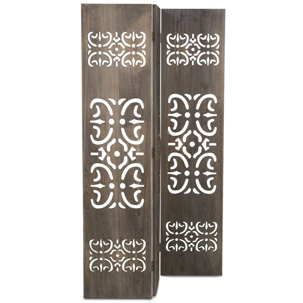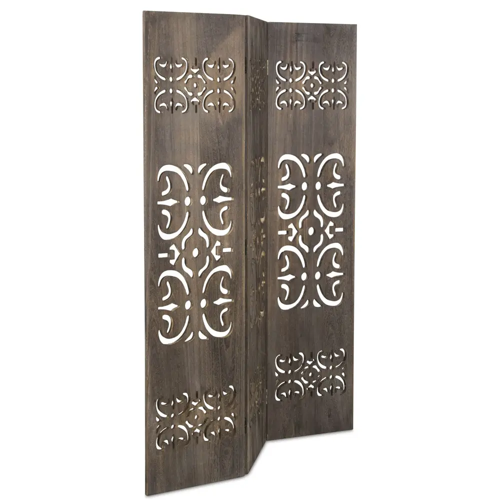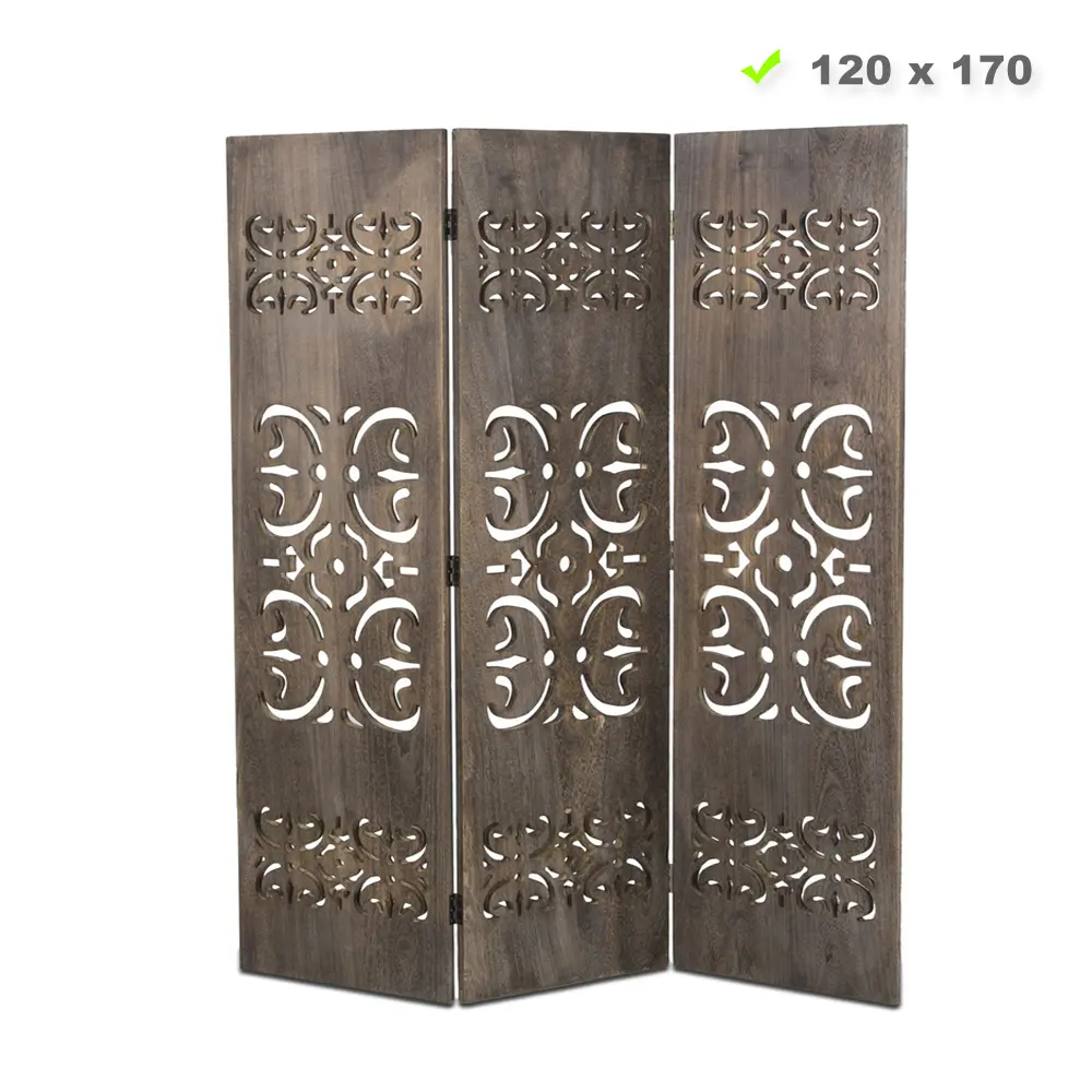 Mit seinem idyllischen Design schafft der Paravent, dessen Breite pro Element auf 40 cm kommt, eine angenehme Wohnatmosphäre. Die beidseitige Art sorgt dafür, dass die filigranen Holzschnitzereien von beiden Seiten gleichermaßen zur Geltung kommen. Die integrierten Scharniere lassen sich in beide Richtungen bewegen, sodass der Paravent individuell aufgestellt und optimal an den jeweiligen Raum angepasst werden kann. Wenn er einmal nicht benötigt wird, lässt sich der Raumteiler mit einer Tiefe von 2 cm einfach zusammenklappen und platzsparend verstauen. Er ist für den Innenbereich konzipiert und eignet sich hervorragend als dekorativer Teil-Sichtschutz oder als Raumtrenner in offenen Wohnkonzepten.