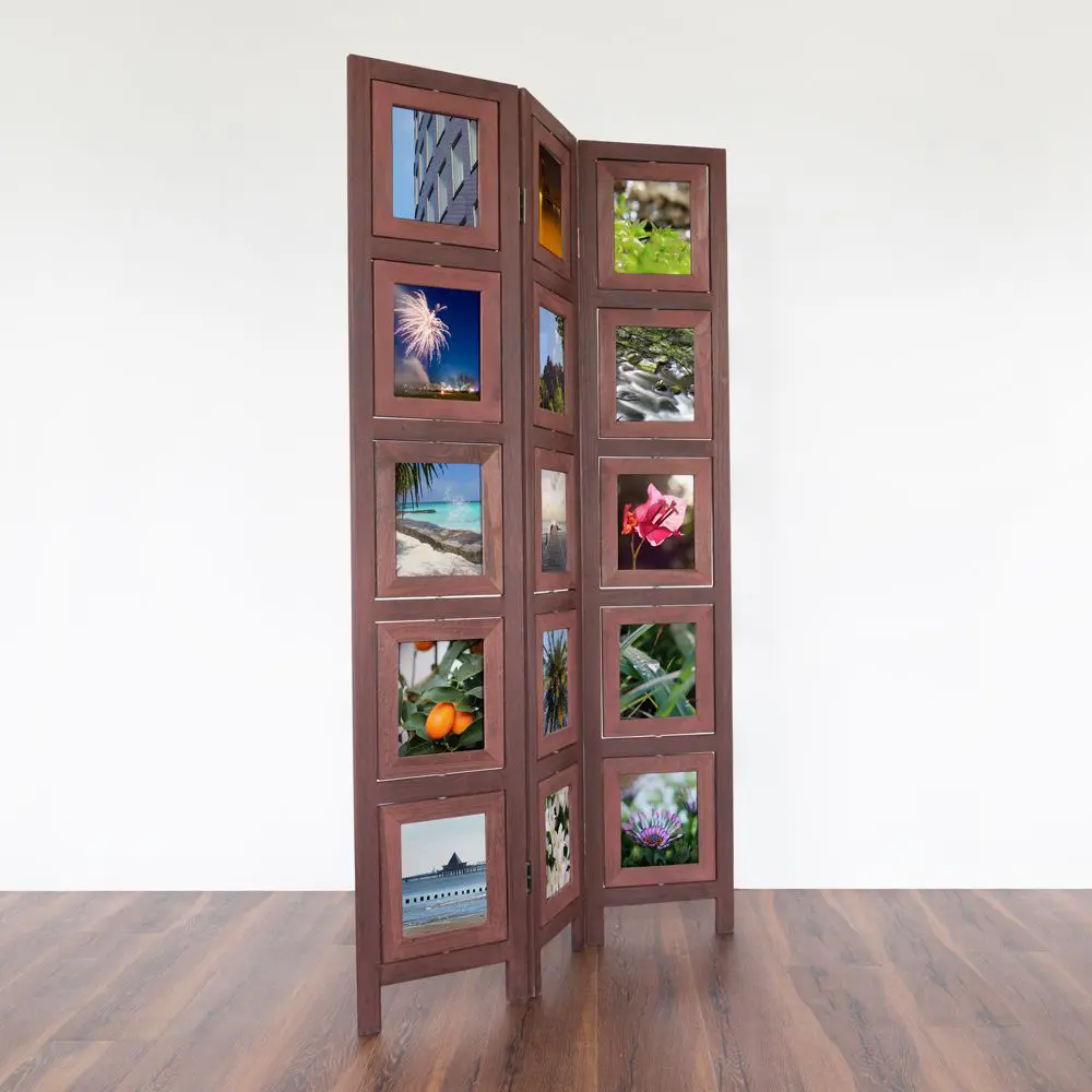 Dekorativer Raumteiler mit Einschubfächern hinter Plexiglas in der Größe 93×161 cm – ein schöner Paravent 3 teilig aus Holz mit 15 einzelnen Fotohaltern, 360 Grad beweglich. Farblich mehrfarbig in hellen und dunklen Brauntönen.