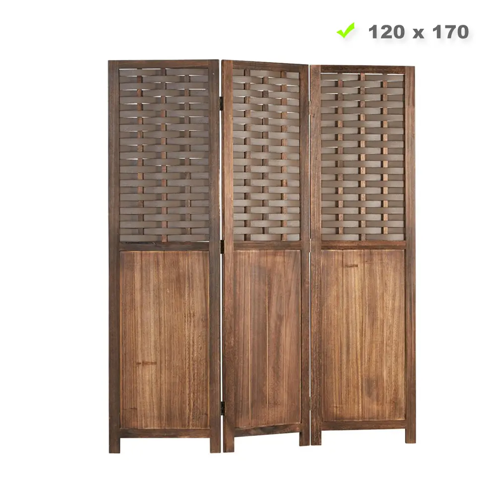 Raumteiler mit Holzlamellen 120×170 cm – Paravent 3 teilig aus Echtholz und Kunststoff in Rattan-Optik – Farbe: Braun