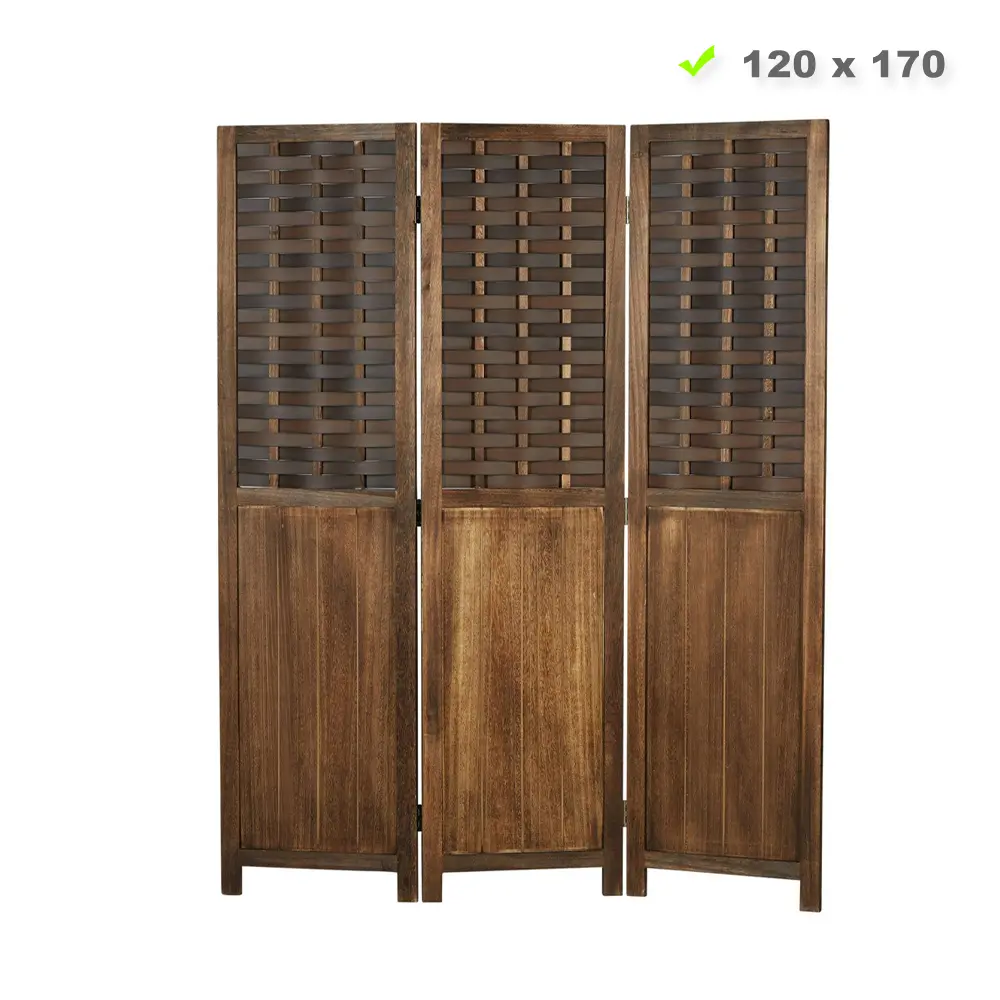 Raumteiler mit Holzpaneelen 120×170 cm – Paravent 3 teilig aus Holz und einem Kunststoffgeflecht – Farbe: Braun Dunkelbraun