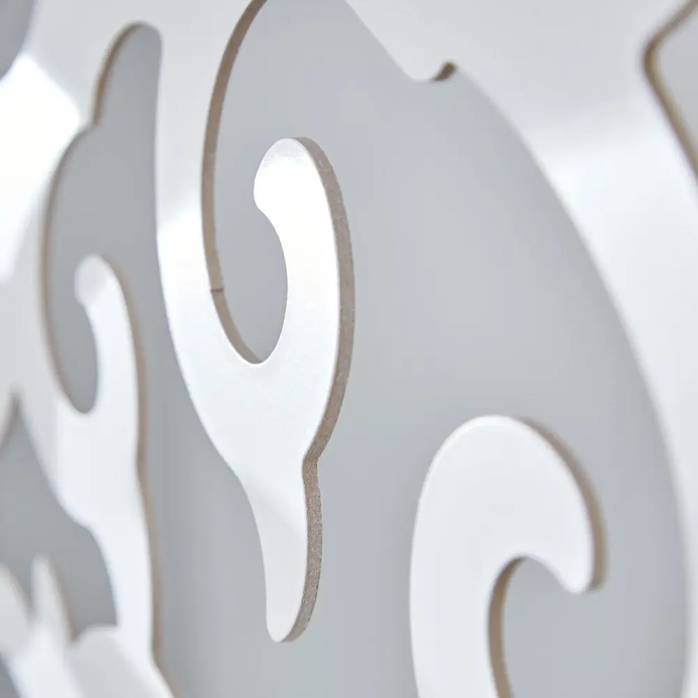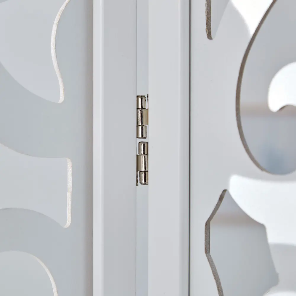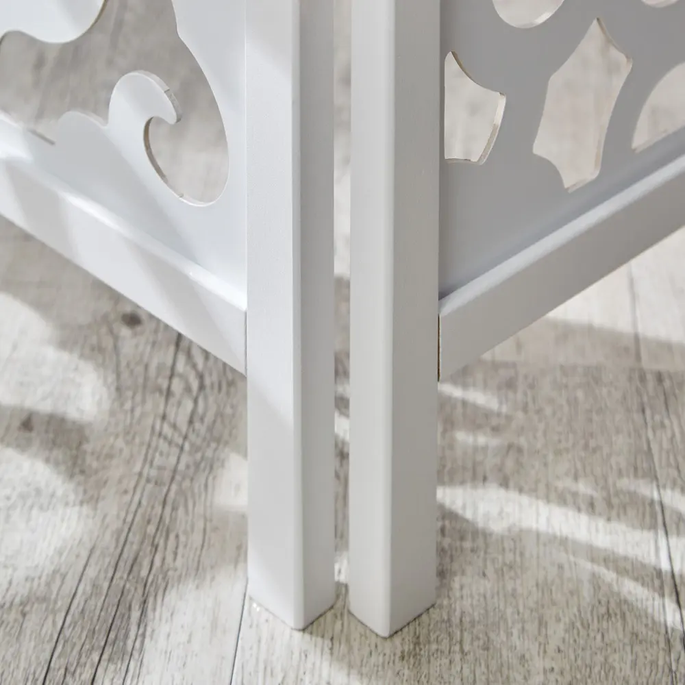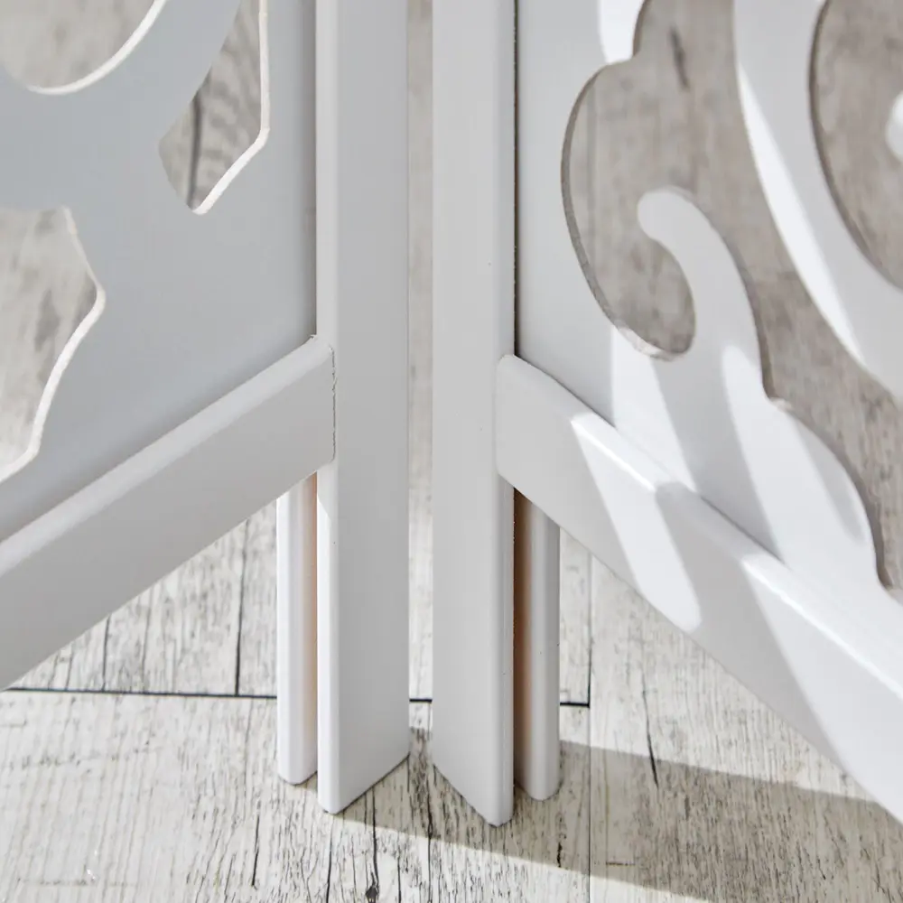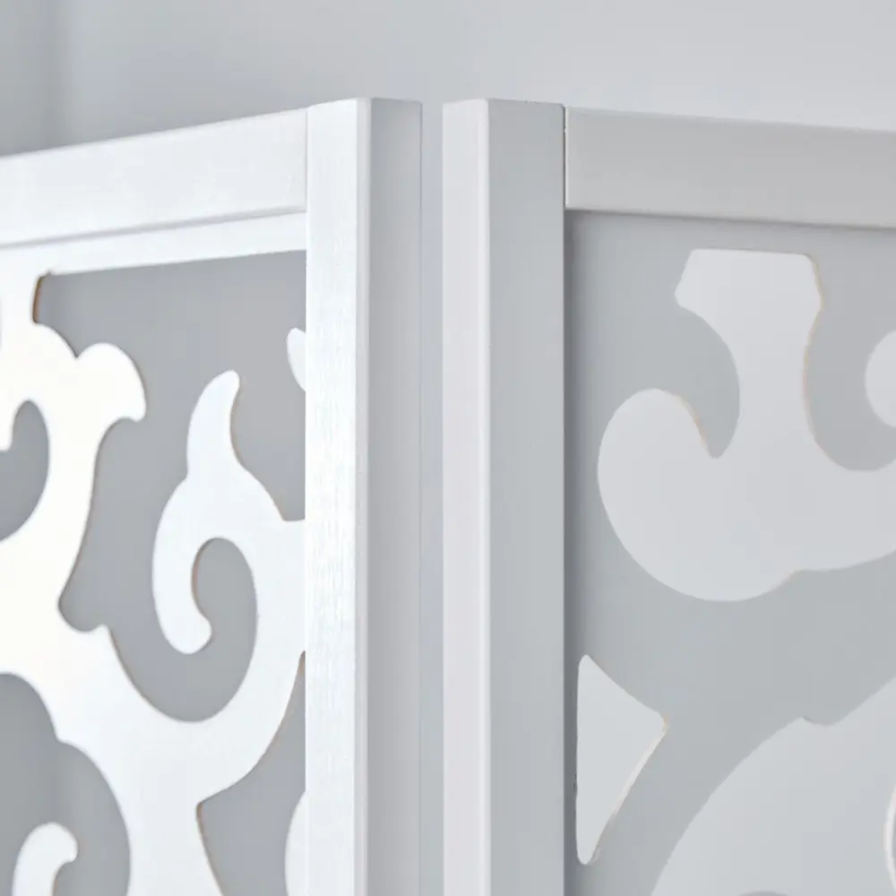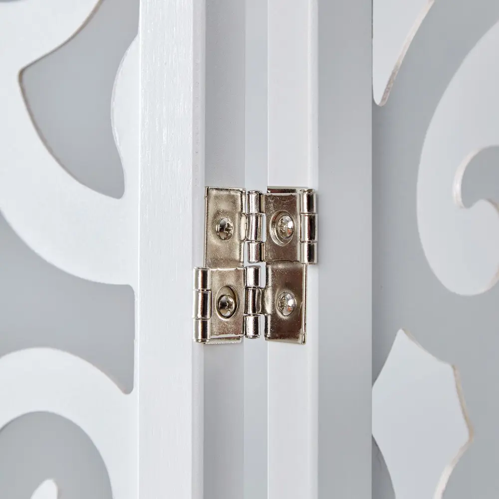 Gefertigt wurde der Rahmen aus stabilem Kiefernholz mit einer weißen Lackierung. Die glatte Oberfläche wirkt zeitlos und lässt sich unkompliziert reinigen. Weiße Holzverzierungen verleihen dem Paravent eine charmante Ausstrahlung. Fein gearbeitete Holzstreben zieren den Innenbereich des Raumteilers und unterstreichen seine hochwertige Verarbeitung. Das weiße Holz bringt eine helle, freundliche Wirkung in den Raum und passt sich verschiedenen Einrichtungsstilen mühelos an – von modern über skandinavisch bis klassisch.