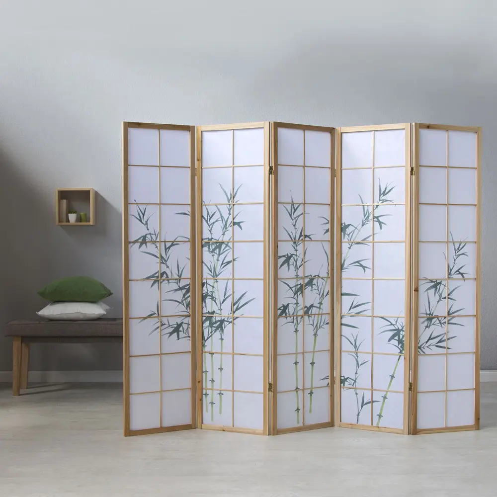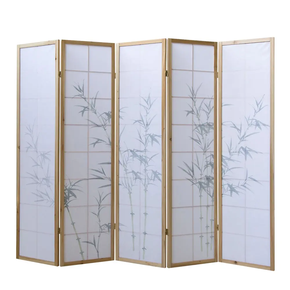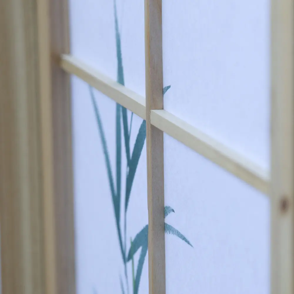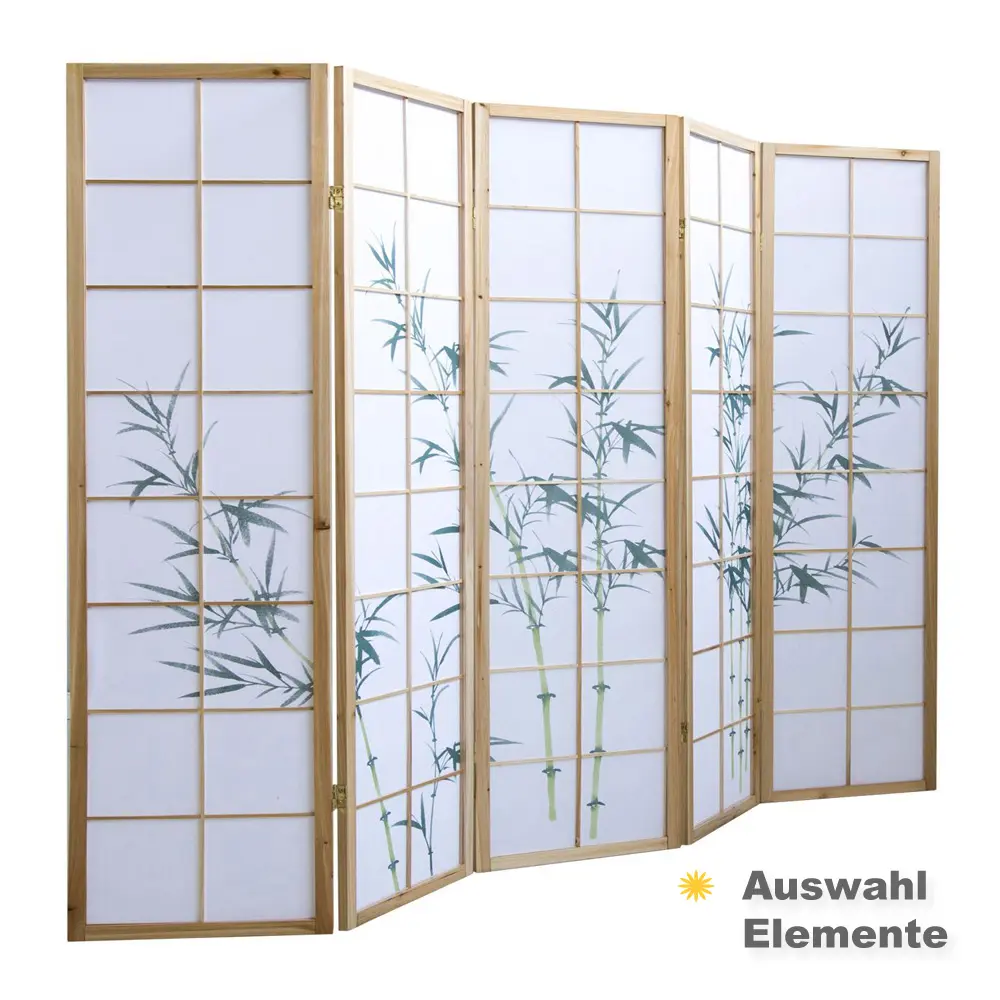 Raumteiler – Paravent 3-5 teilig Holz mit Shoji Reispapier und Bambus-Motiv in Grün – Farbe: Natur