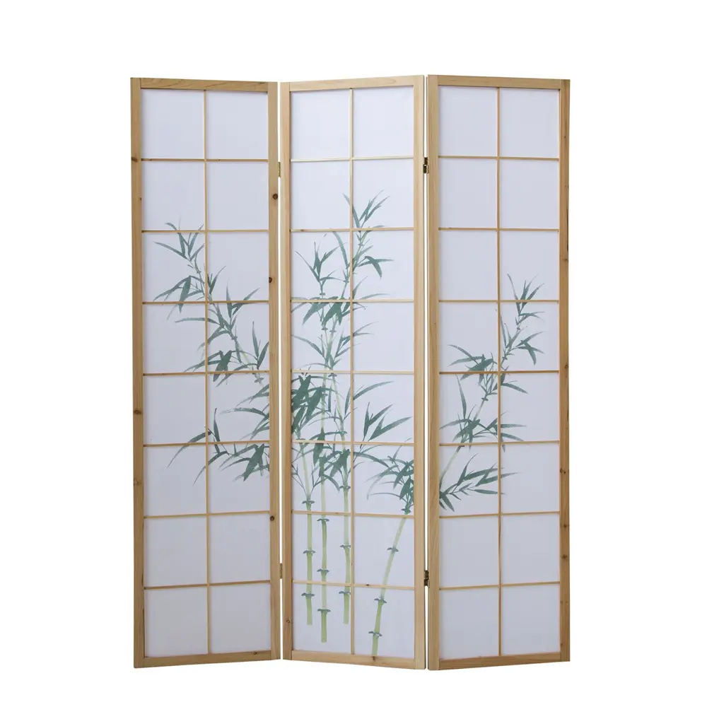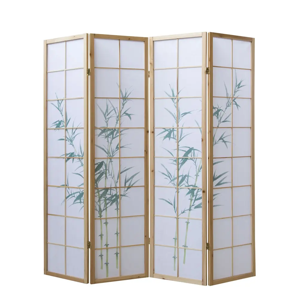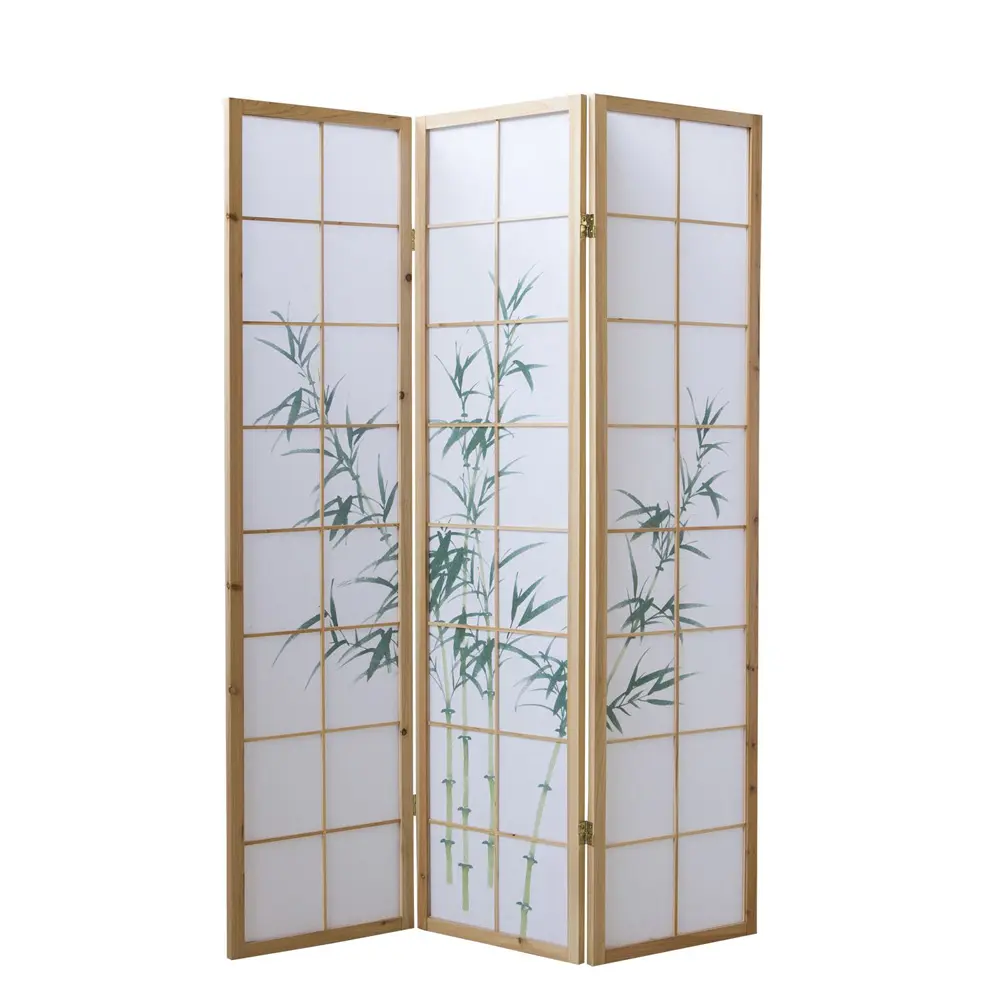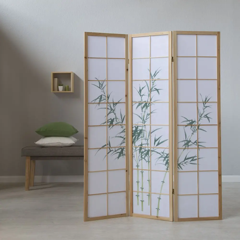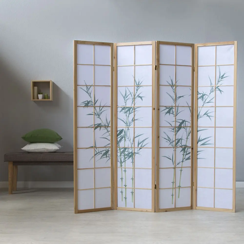 Raumteiler – Paravent 3-5 teilig Holz mit Shoji Reispapier und Bambus-Motiv in Grün – Farbe: Natur
