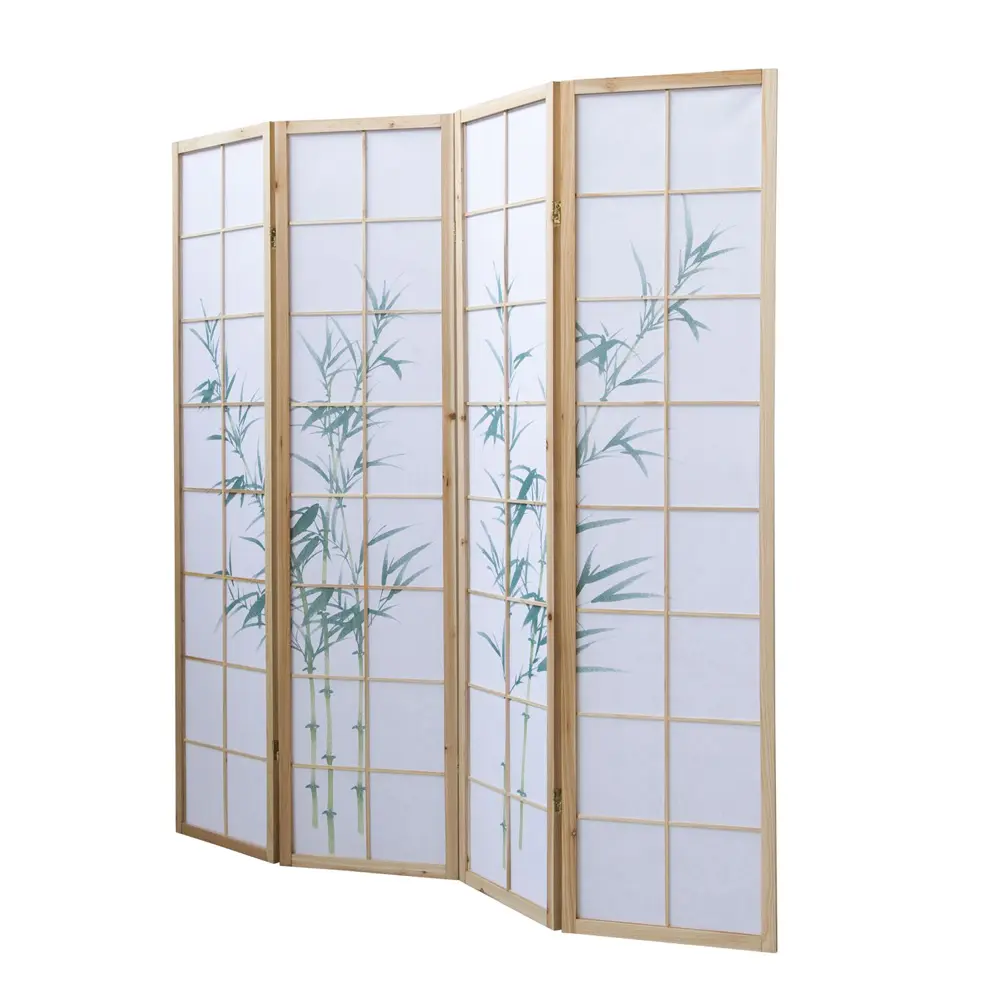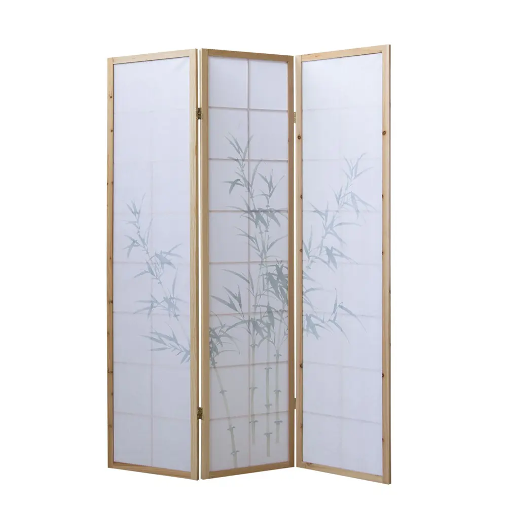Der Rahmen des Paravents besteht aus klar lackiertem Holz, Kiefernholz in natürlicher Ausführung. Die Bespannung wurde aus hochwertigem Shoji-Papier gefertigt und mit einem dezenten Bambusmotiv versehen. Diese Kombination aus Naturmaterialien und Asia-Gestaltungskunst macht den Raumteiler zu einem schönen Wohnaccessoire.
