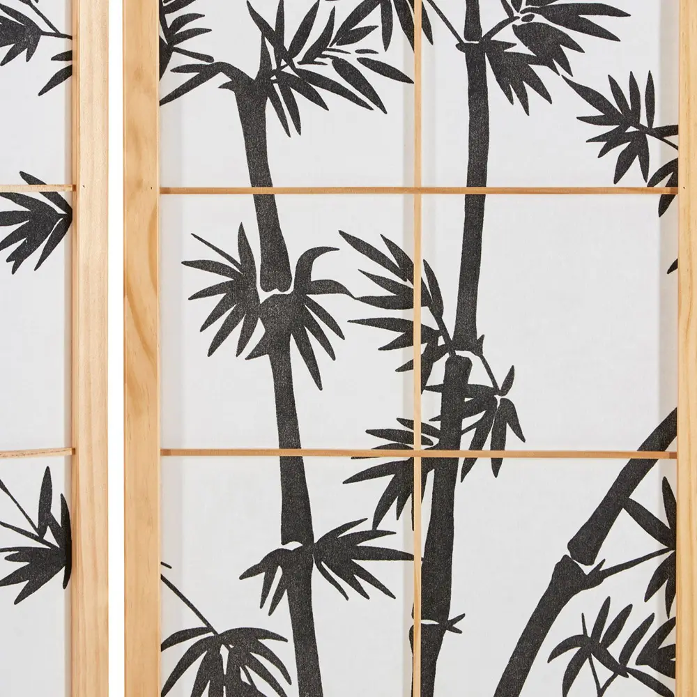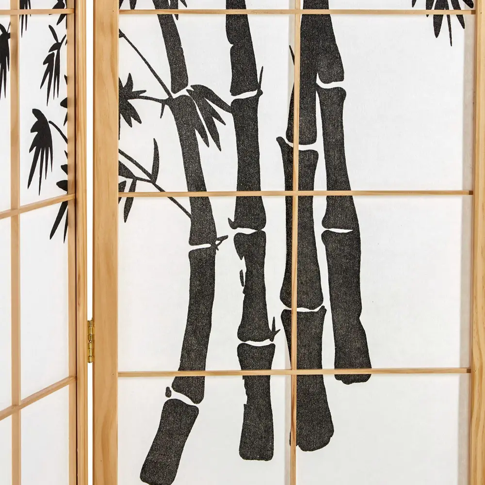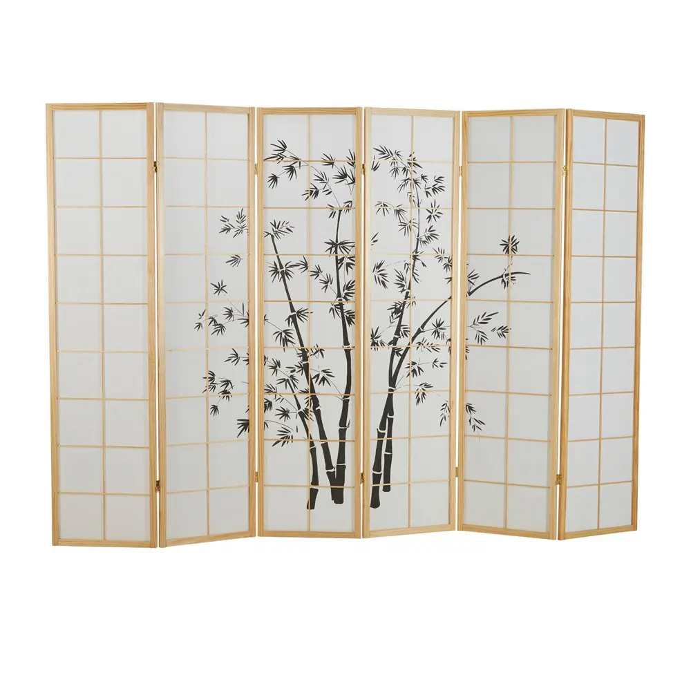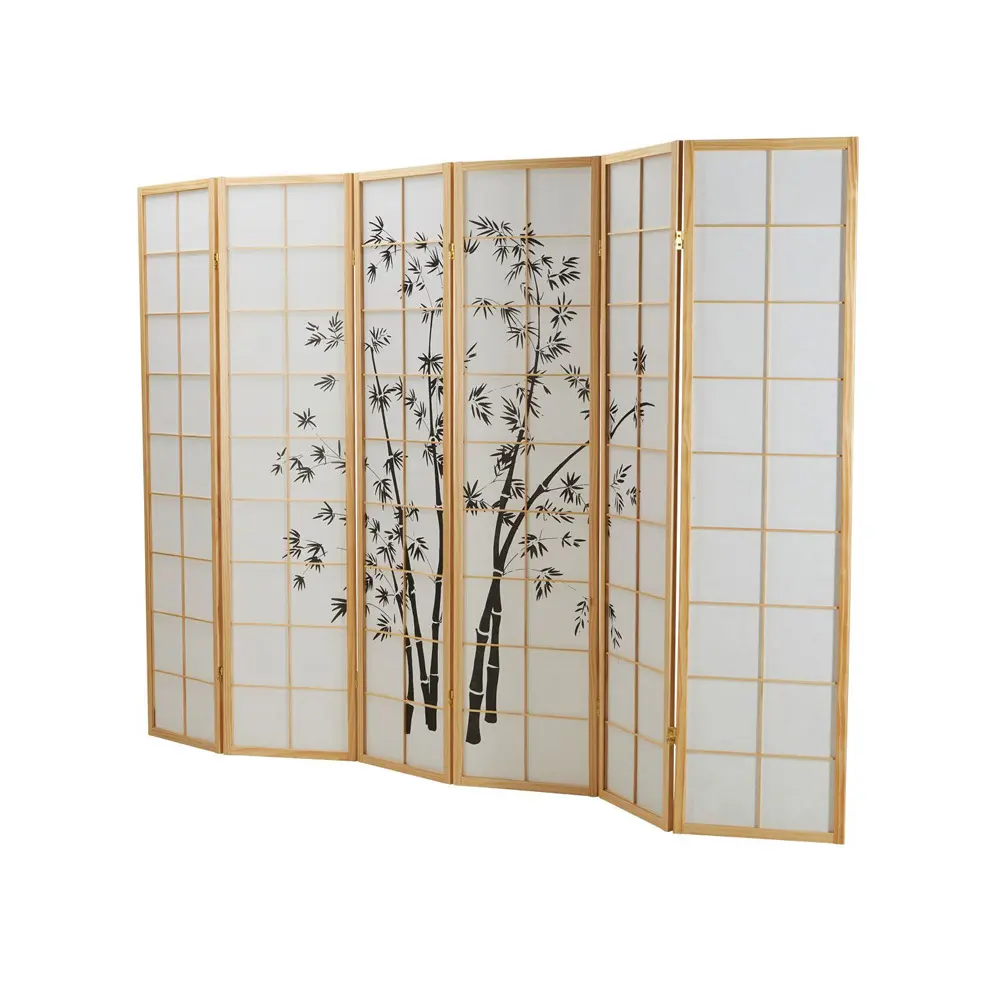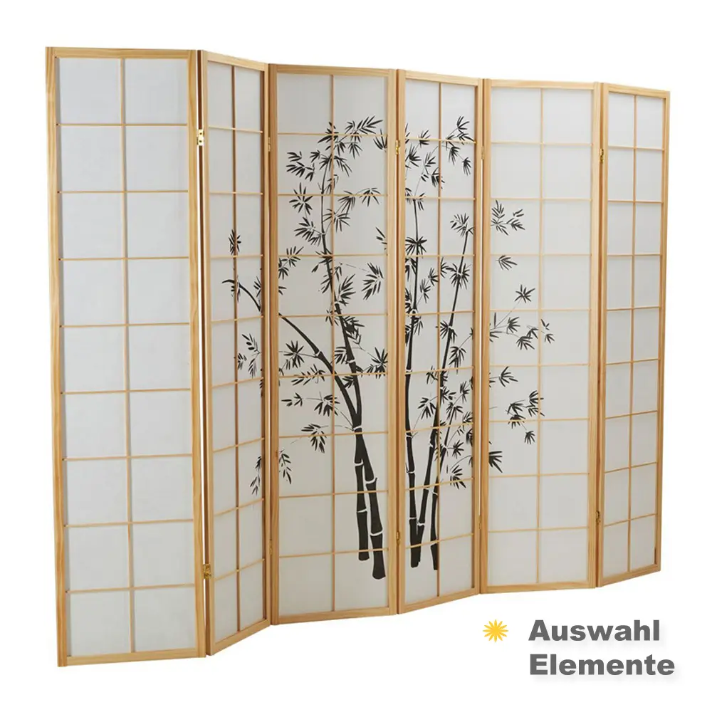 Raumteiler – Paravent 3-6 teilig Holz mit Shoji Reispapier und Bambus-Motiv in Schwarz – Farbe: Natur