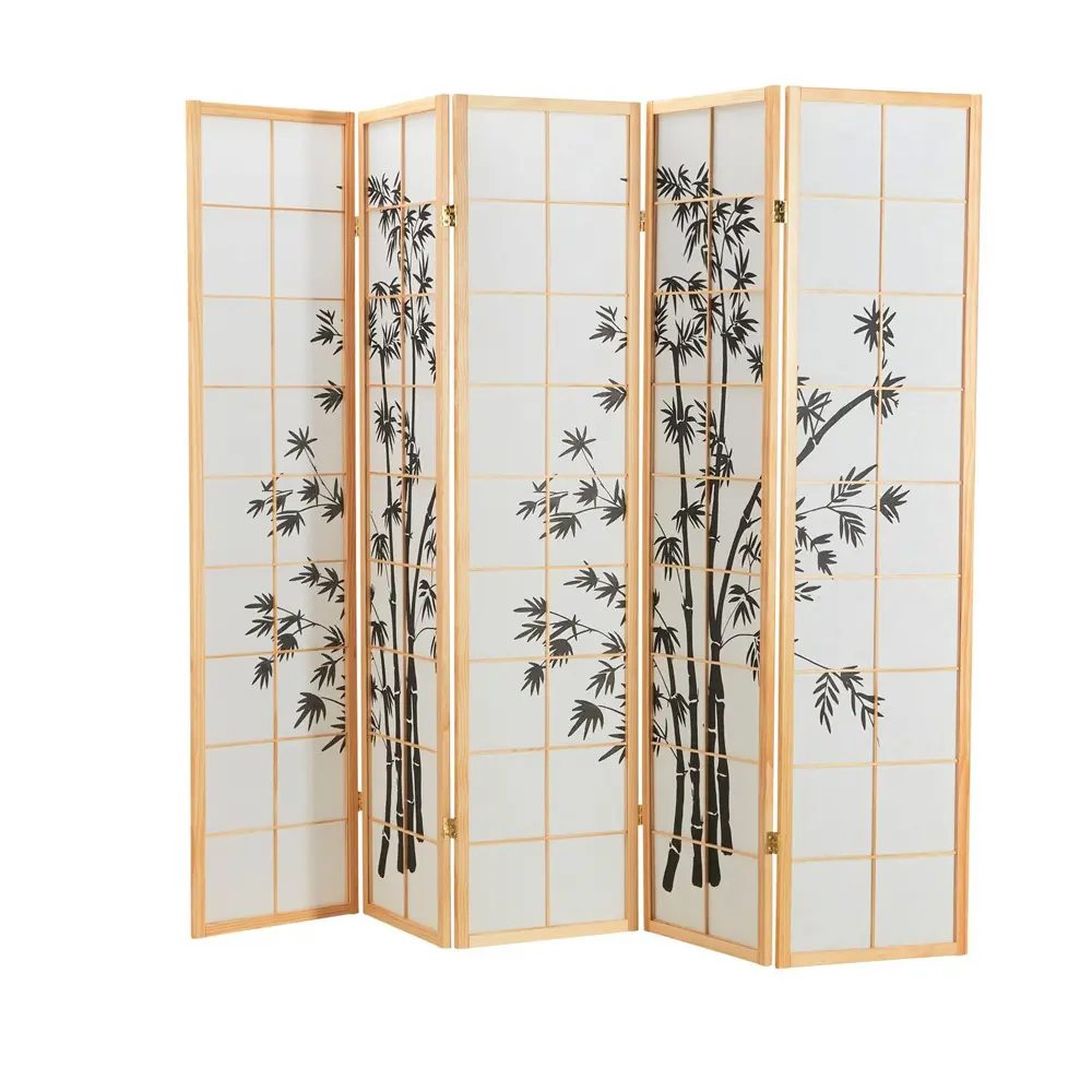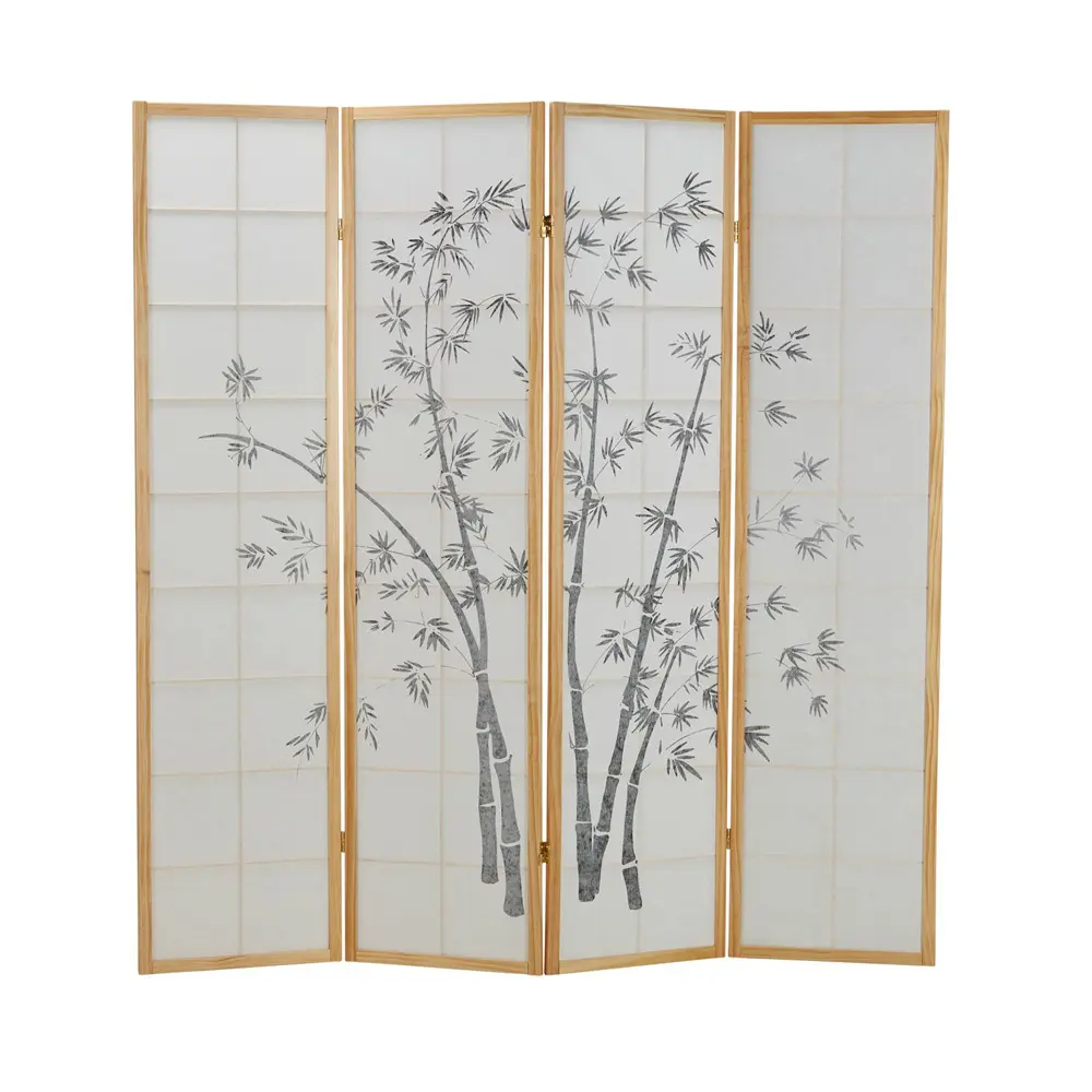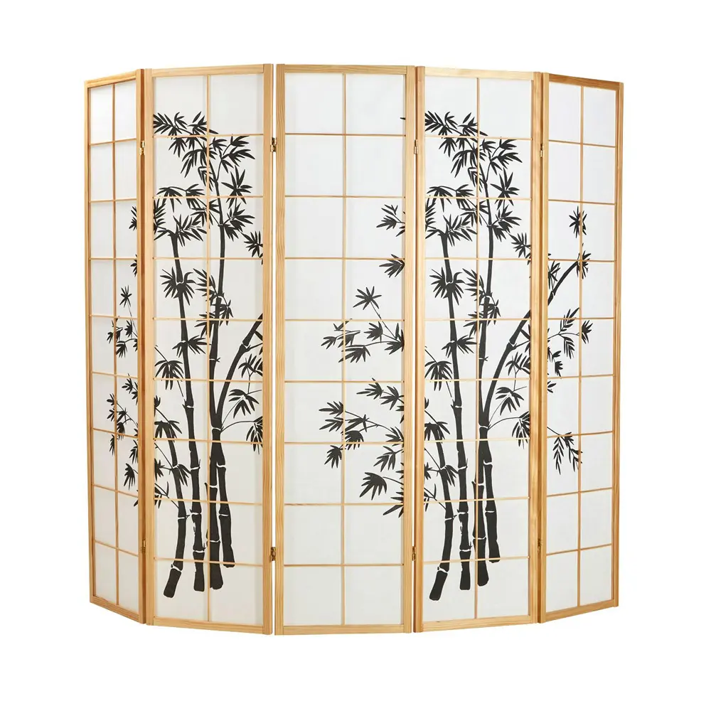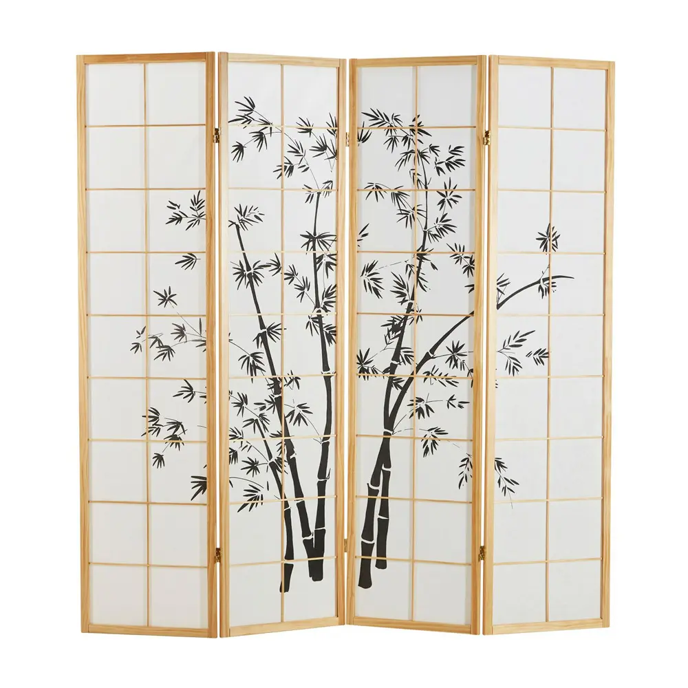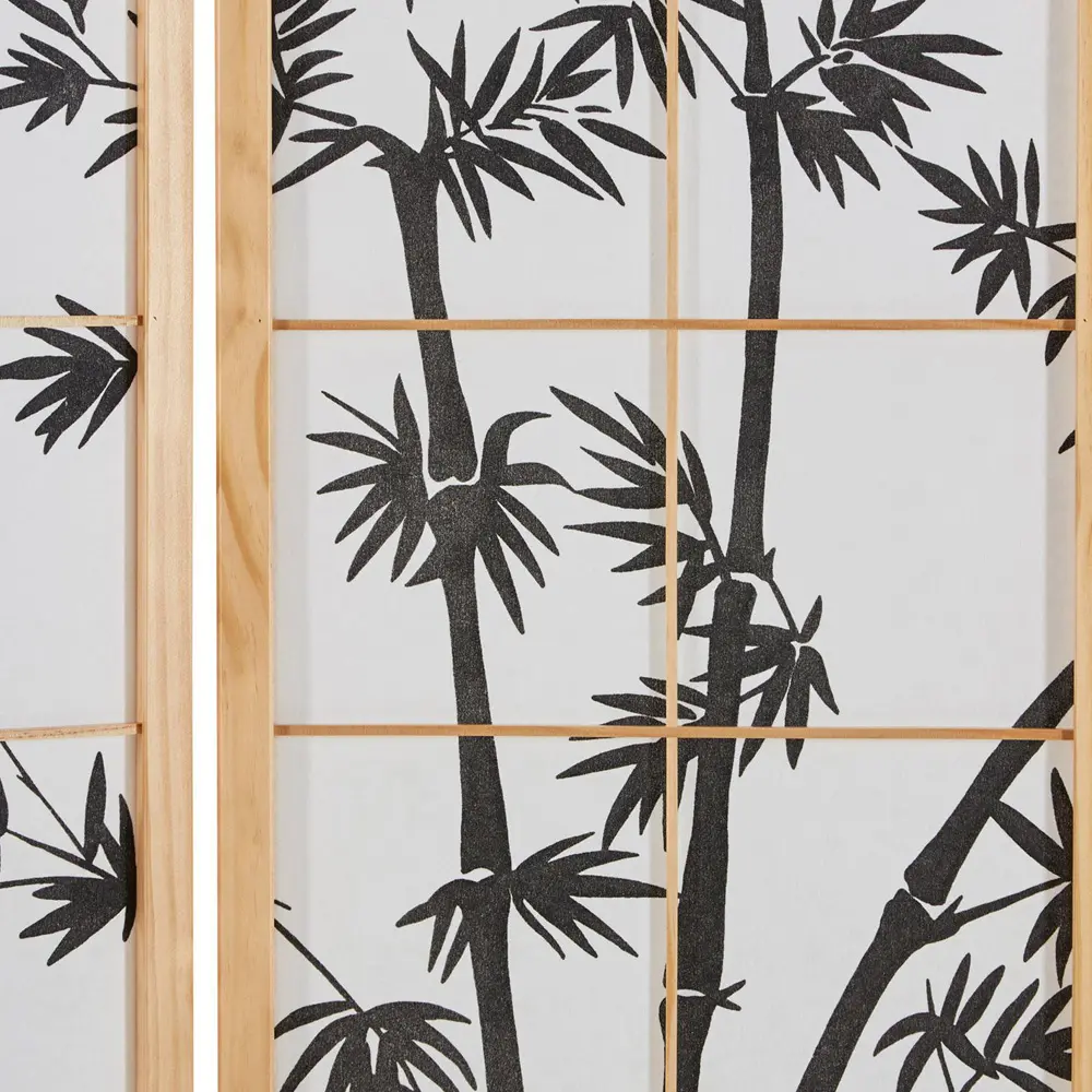Raumteiler – Paravent 3-6 teilig Holz mit Shoji Reispapier und Bambus-Motiv in Schwarz – Farbe: Natur