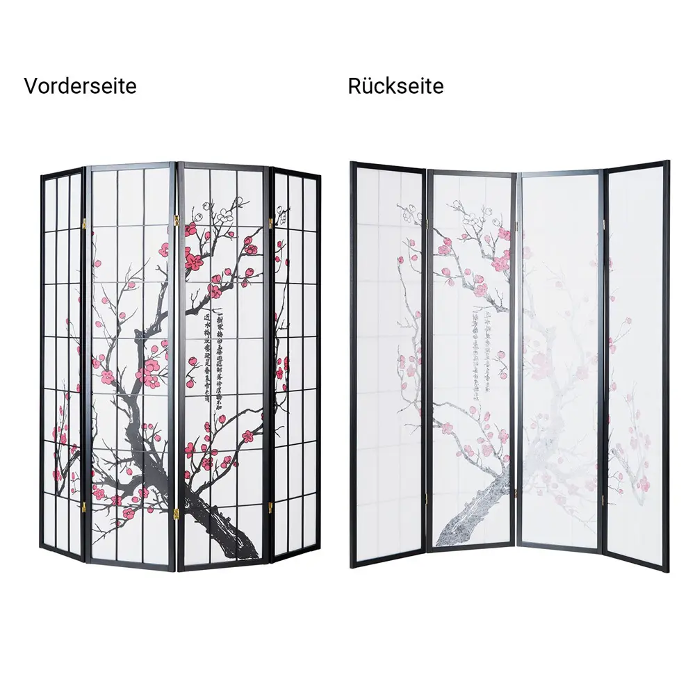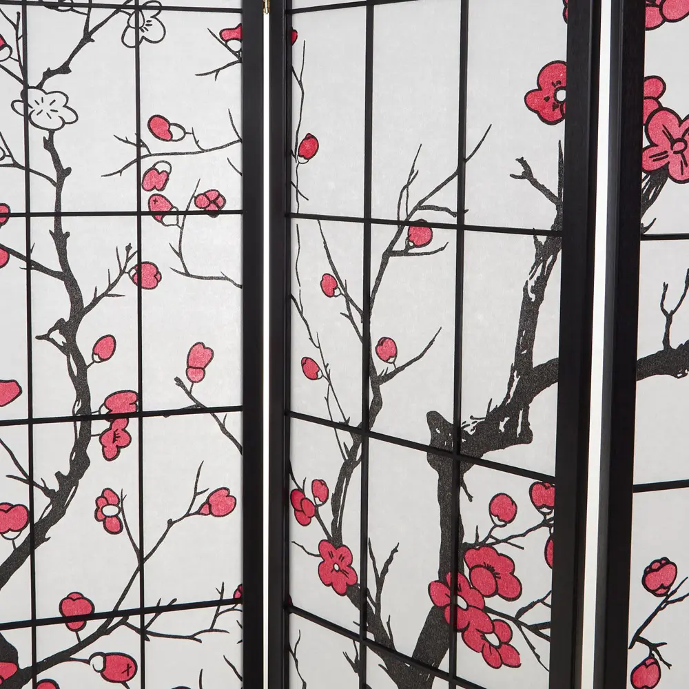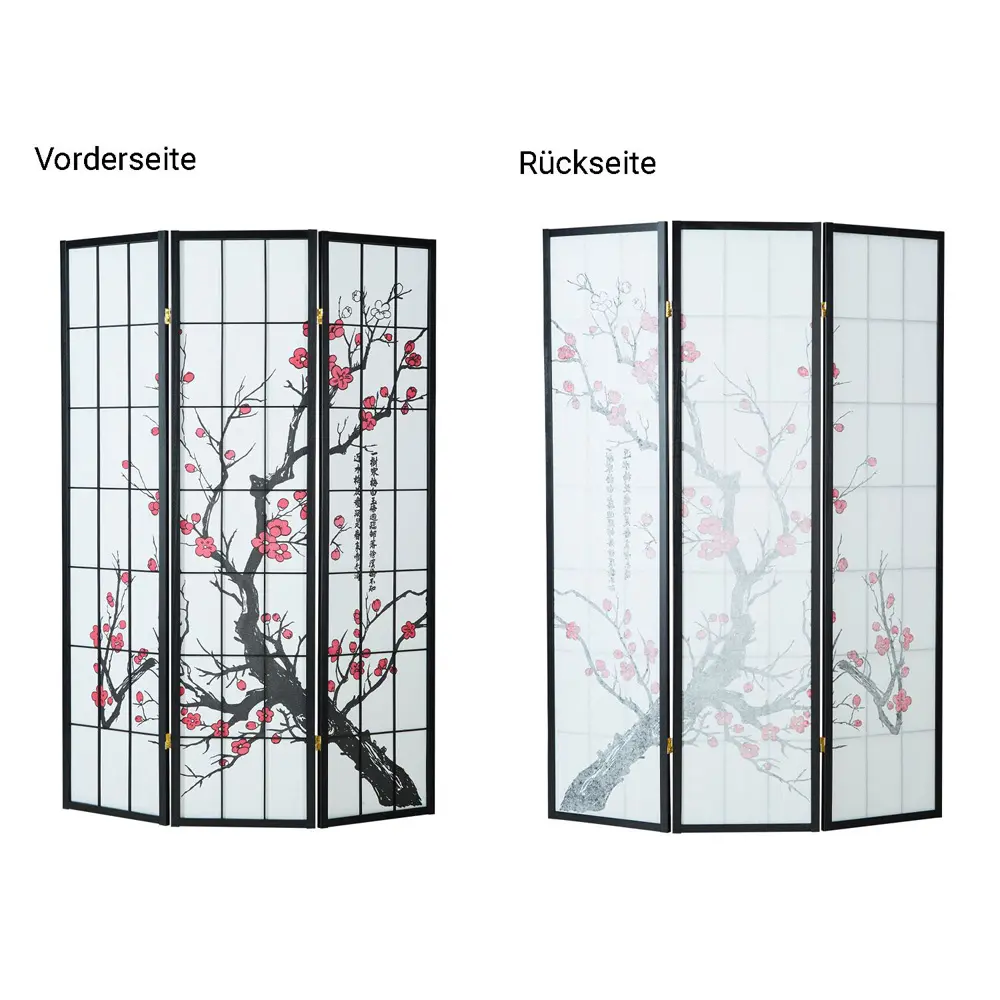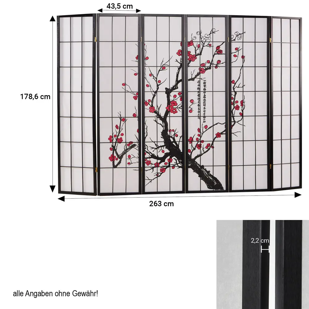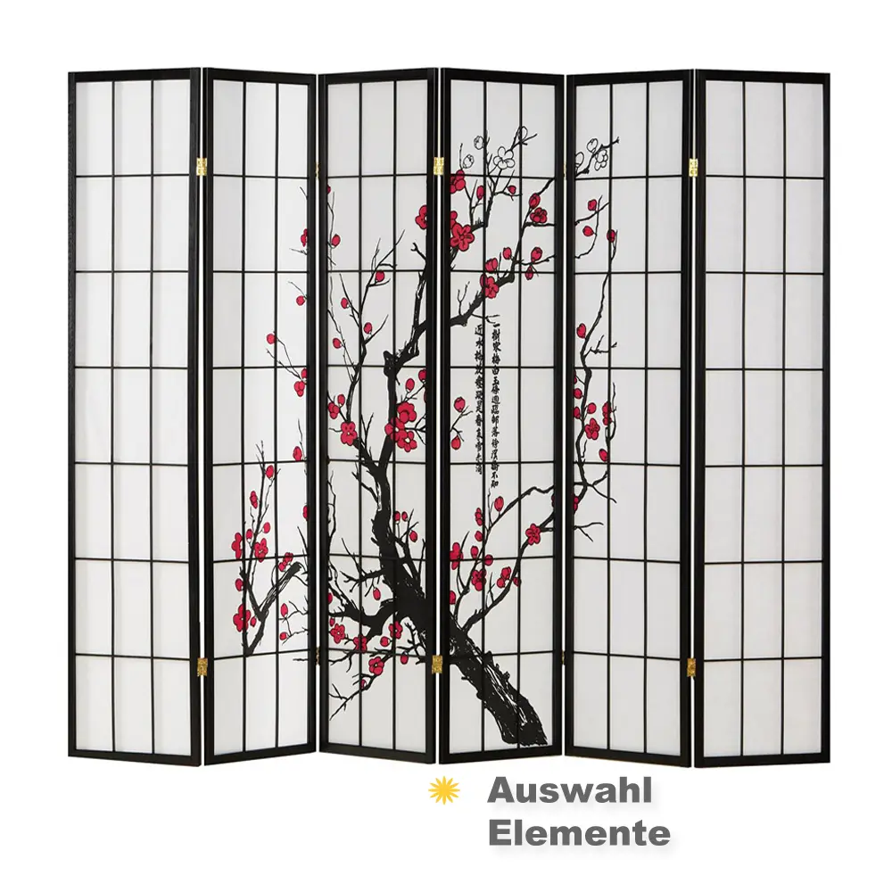 Ein fantastischer Raumteiler – ein Paravent 3-6 teilig, mit einem Rahmen aus edlem schwarz lackiertem Holz und einer Bespannung aus Shoji Reispapier. Auf dem Papier ist ein auffälliges Kirschblüten-Motiv in den Farben Rot und Schwarz. Die Holzstreben haben ebenfalls eine passende, schwarze Farbe.