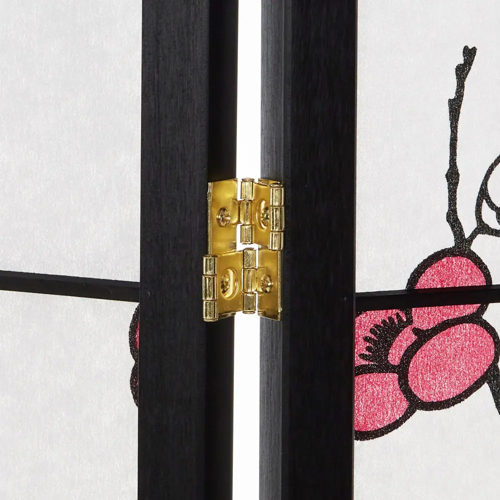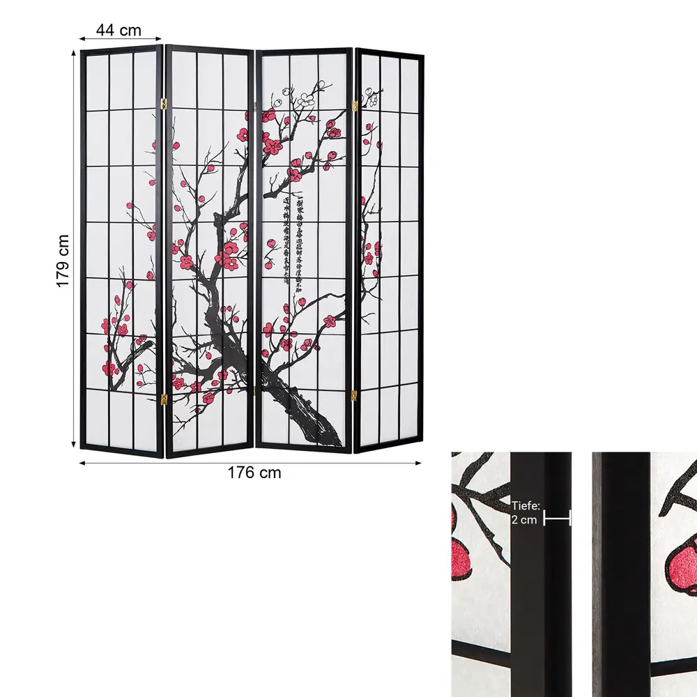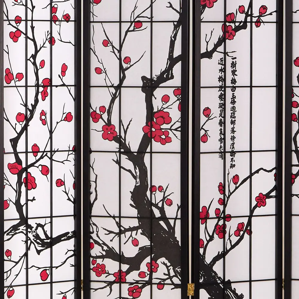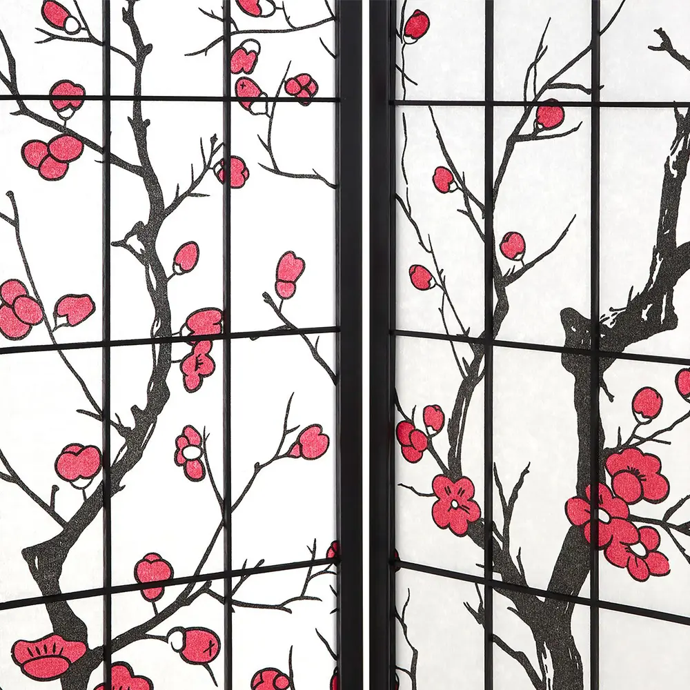 Ein fantastischer Raumteiler – ein Paravent 3-6 teilig, mit einem Rahmen aus edlem schwarz lackiertem Holz und einer Bespannung aus Shoji Reispapier. Auf dem Papier ist ein auffälliges Kirschblüten-Motiv in den Farben Rot und Schwarz. Die Holzstreben haben ebenfalls eine passende, schwarze Farbe.