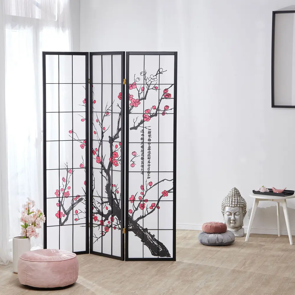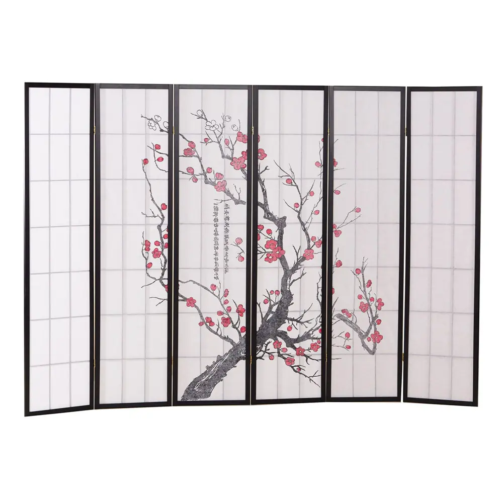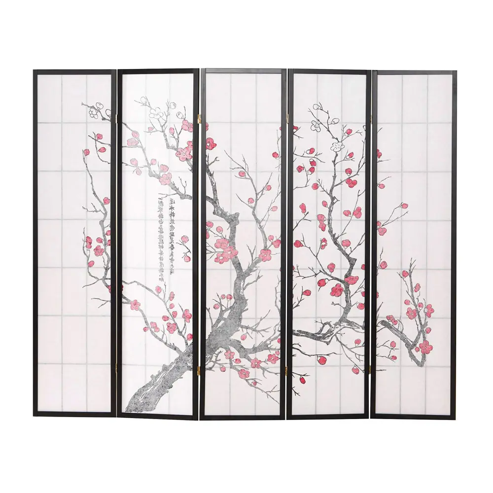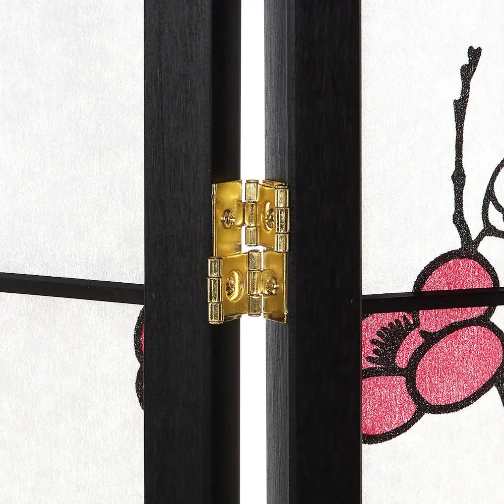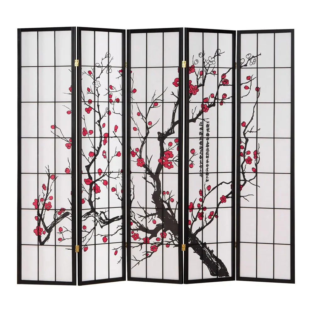 Ein fantastischer Raumteiler – ein Paravent 3-6 teilig, mit einem Rahmen aus edlem schwarz lackiertem Holz und einer Bespannung aus Shoji Reispapier. Auf dem Papier ist ein auffälliges Kirschblüten-Motiv in den Farben Rot und Schwarz. Die Holzstreben haben ebenfalls eine passende, schwarze Farbe.