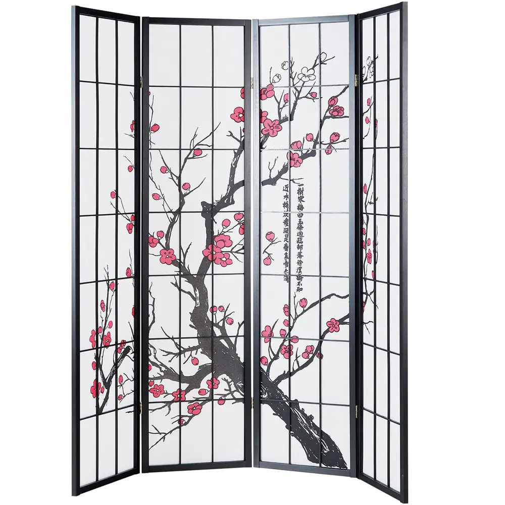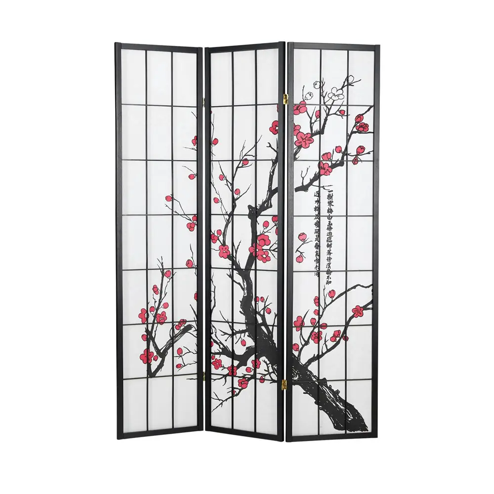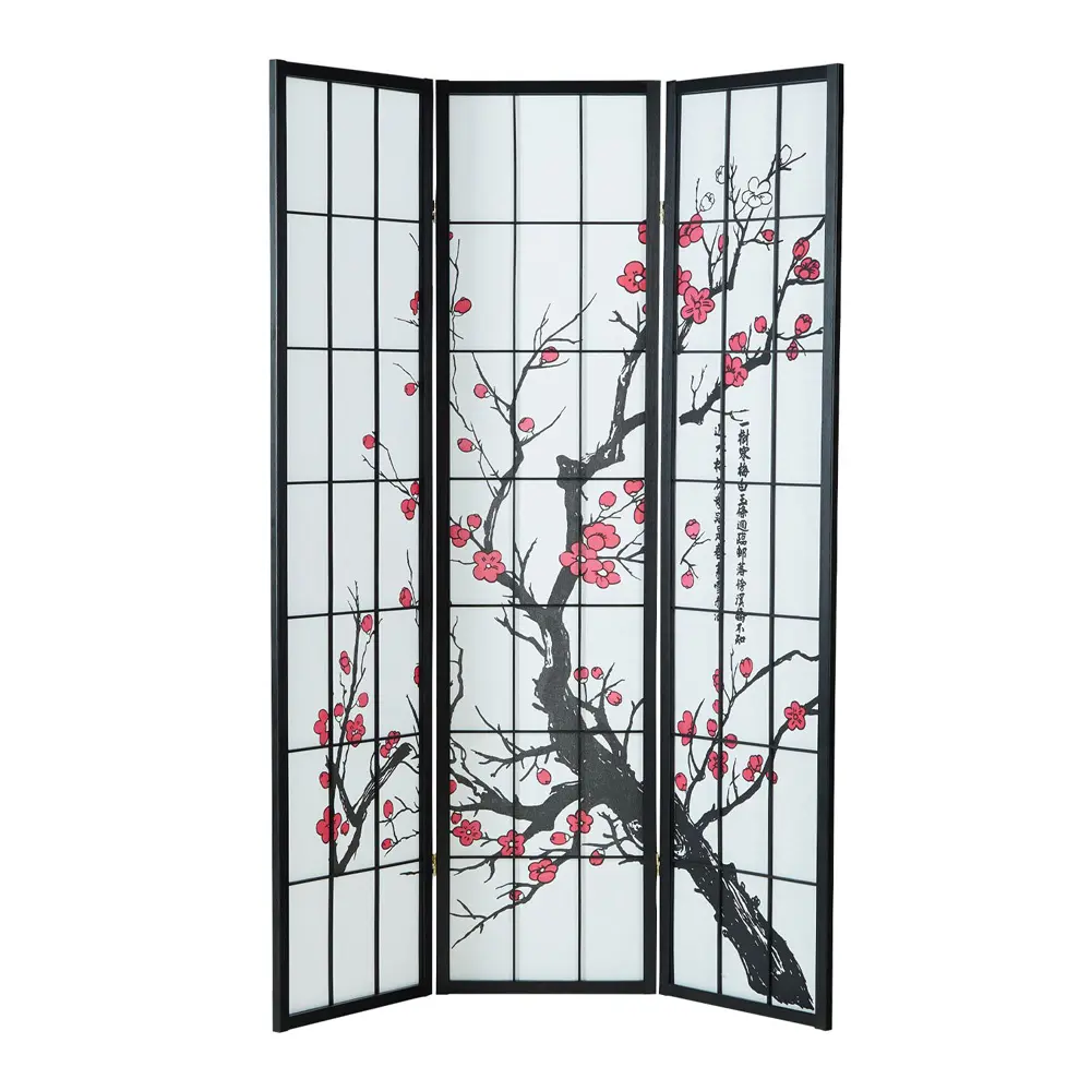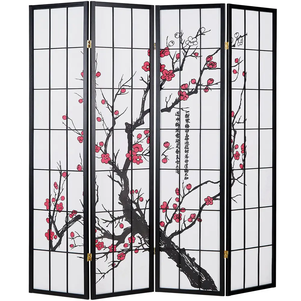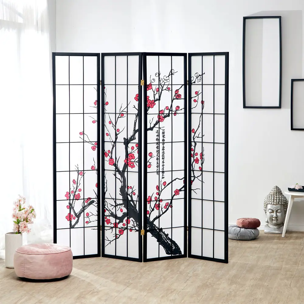 Ein fantastischer Raumteiler – ein Paravent 3-6 teilig, mit einem Rahmen aus edlem schwarz lackiertem Holz und einer Bespannung aus Shoji Reispapier. Auf dem Papier ist ein auffälliges Kirschblüten-Motiv in den Farben Rot und Schwarz. Die Holzstreben haben ebenfalls eine passende, schwarze Farbe.