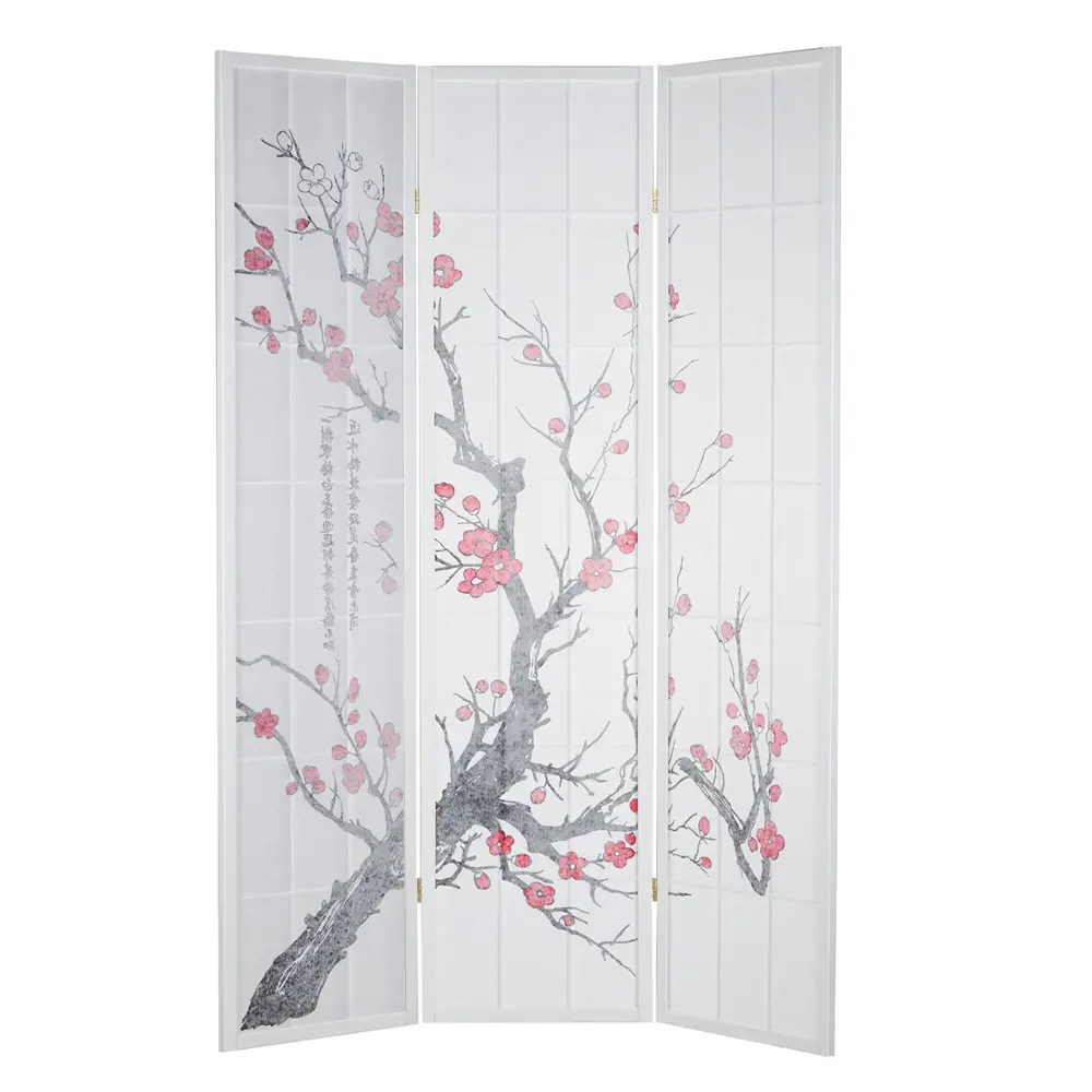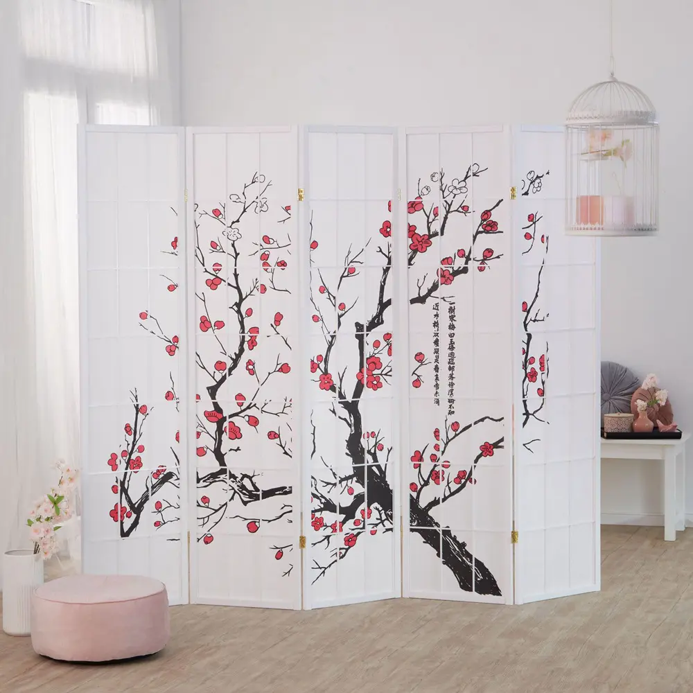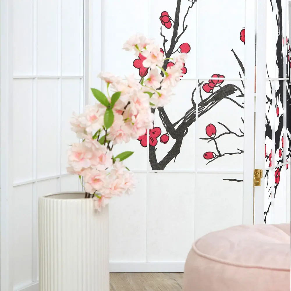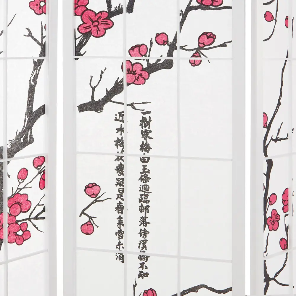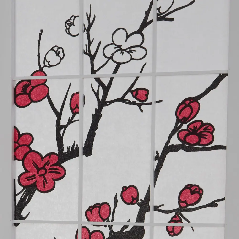 Angelehnt an traditionelle japanische Gestaltungskunst präsentiert sich dieser Raumteiler mit schlanken Holzleisten, zartem Kirschzweig-Design und der halbtransparenten Struktur des Shoji-Papiers. Das durchscheinende Material sorgt für sanftes Lichtspiel und schafft dezente Raumgliederung, ohne den Raum zu beschweren.