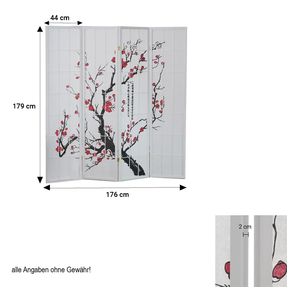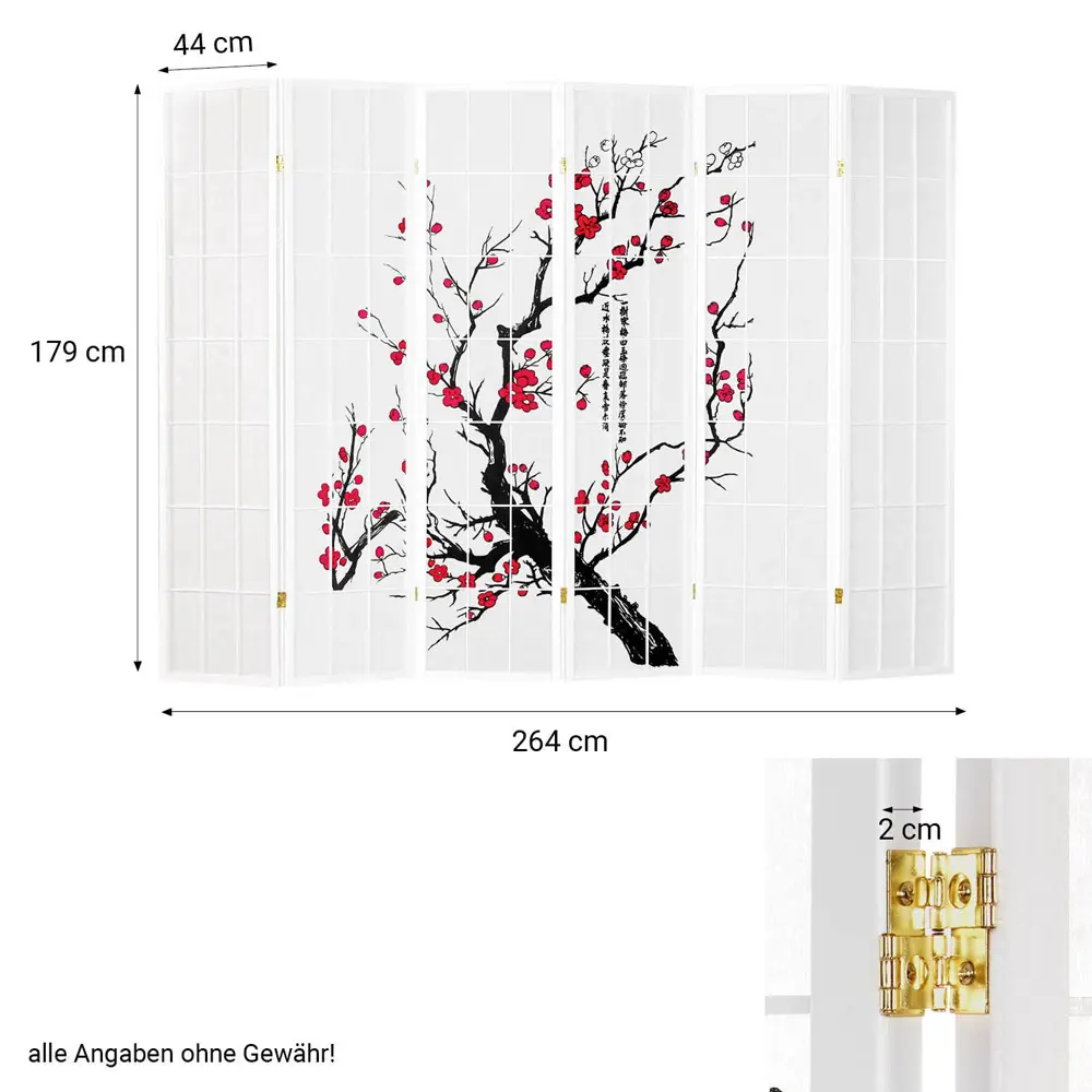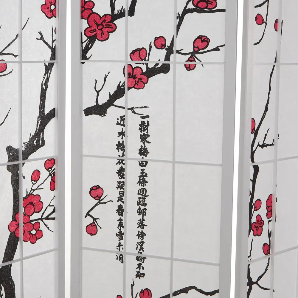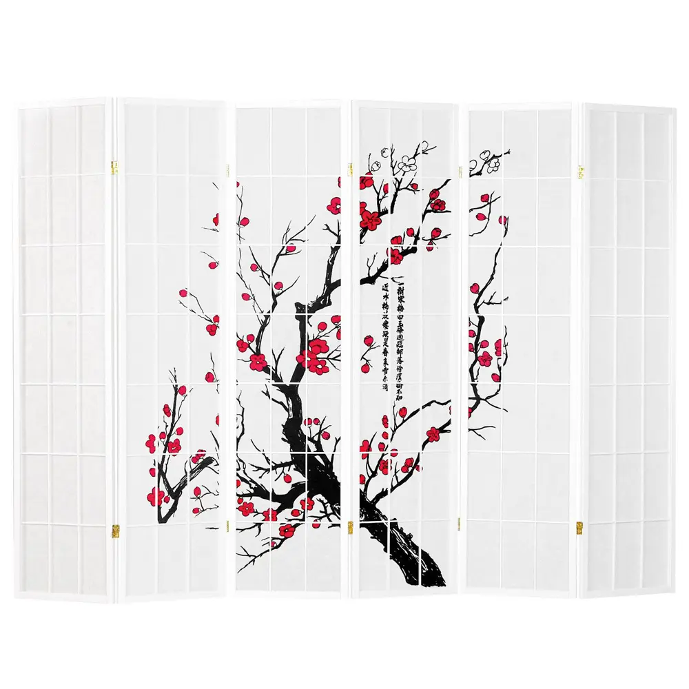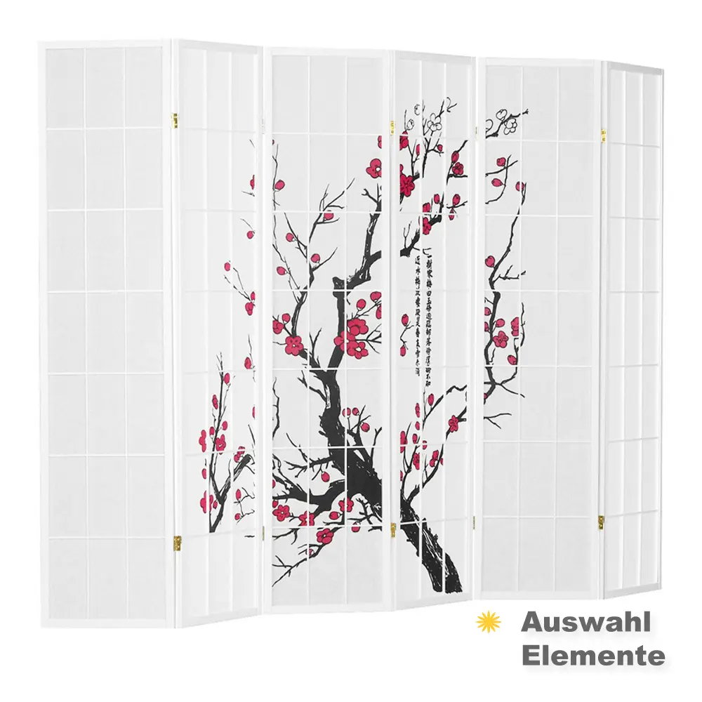 Raumteiler – Paravent 3-6 teilig Holz mit Shoji Reispapier und Motiv in Rot und Schwarz – Farbe: Weiß