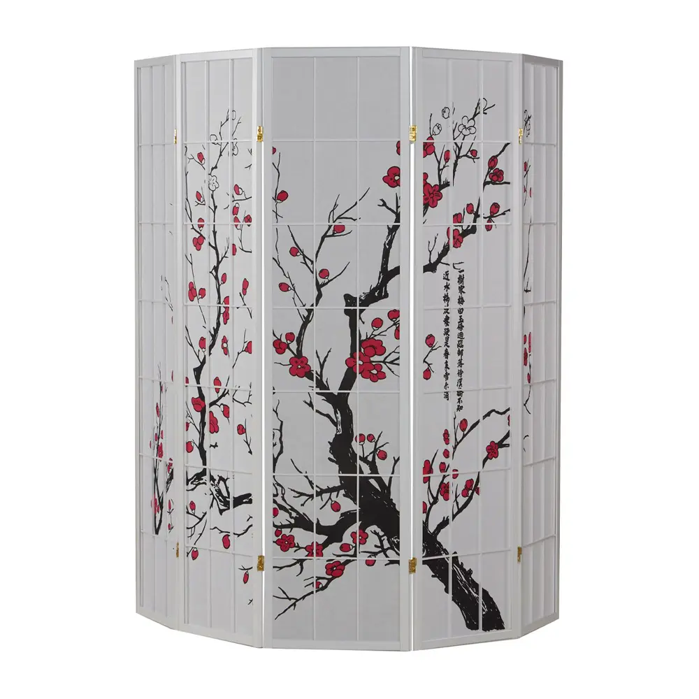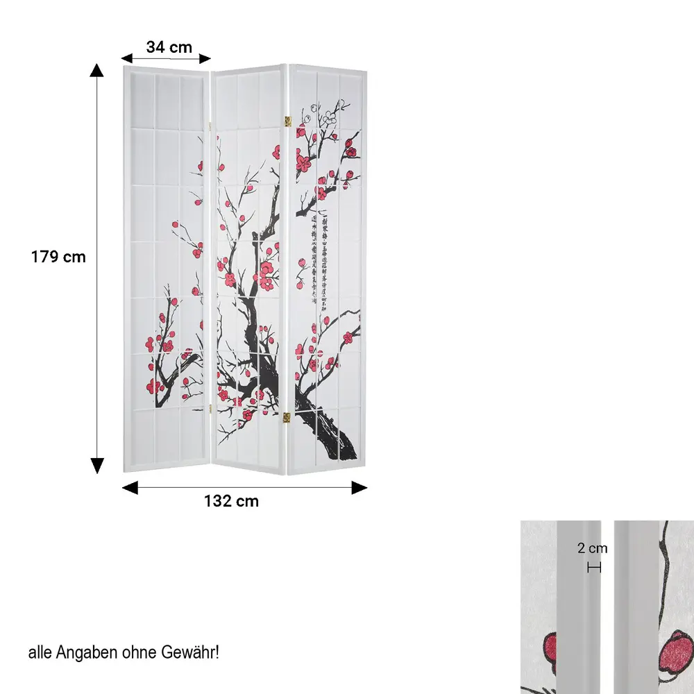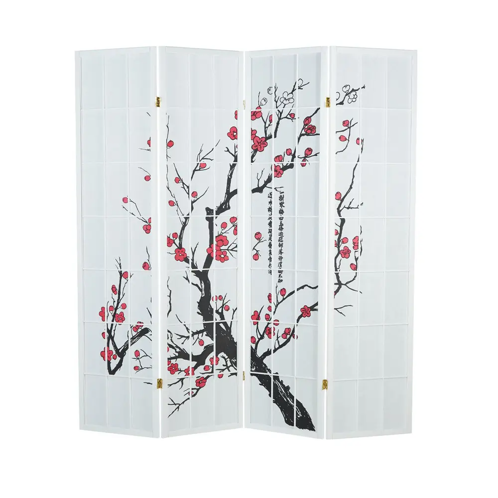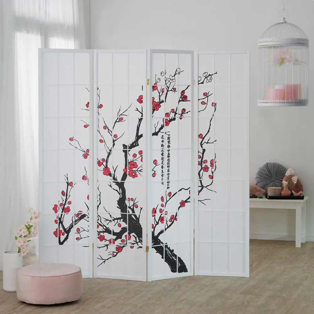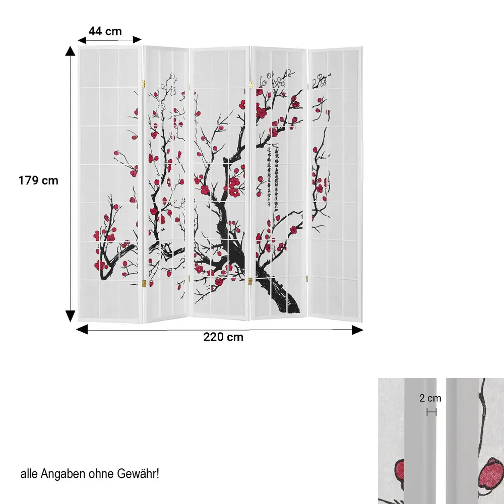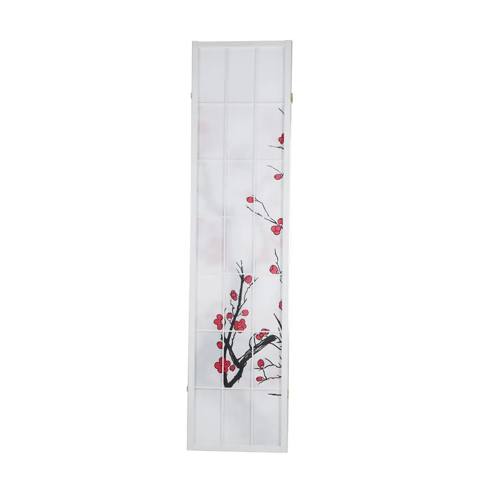 Raumteiler – Paravent 3-6 teilig Holz mit Shoji Reispapier und Motiv in Rot und Schwarz – Farbe: Weiß