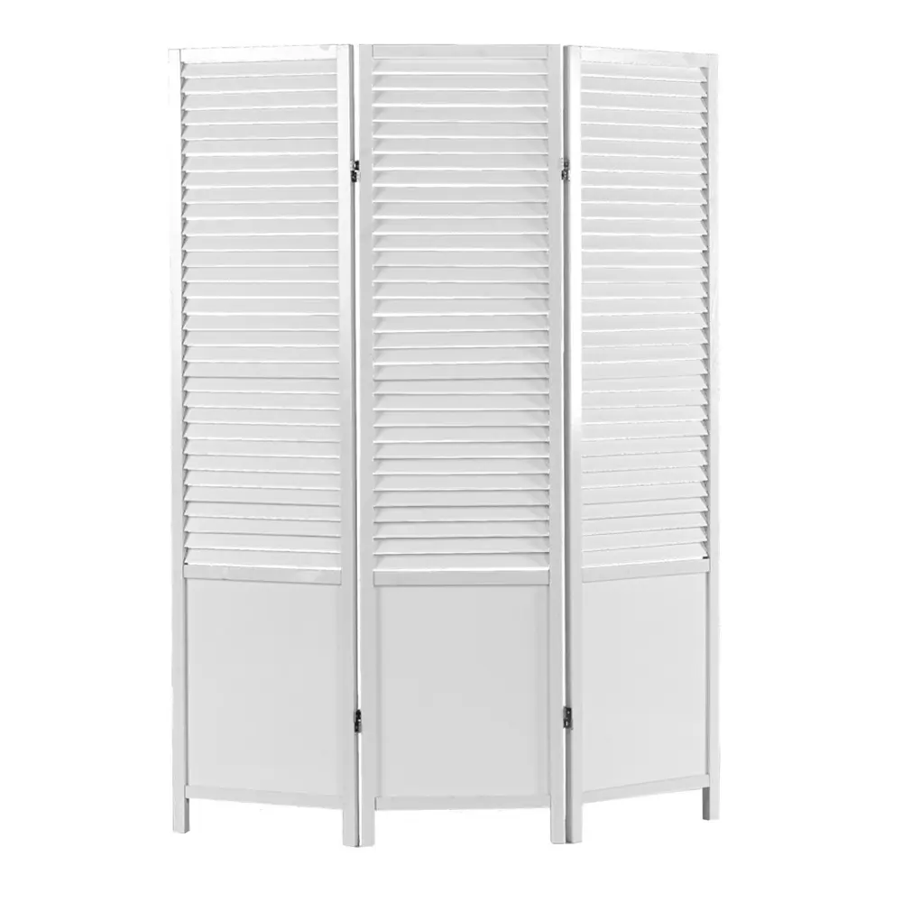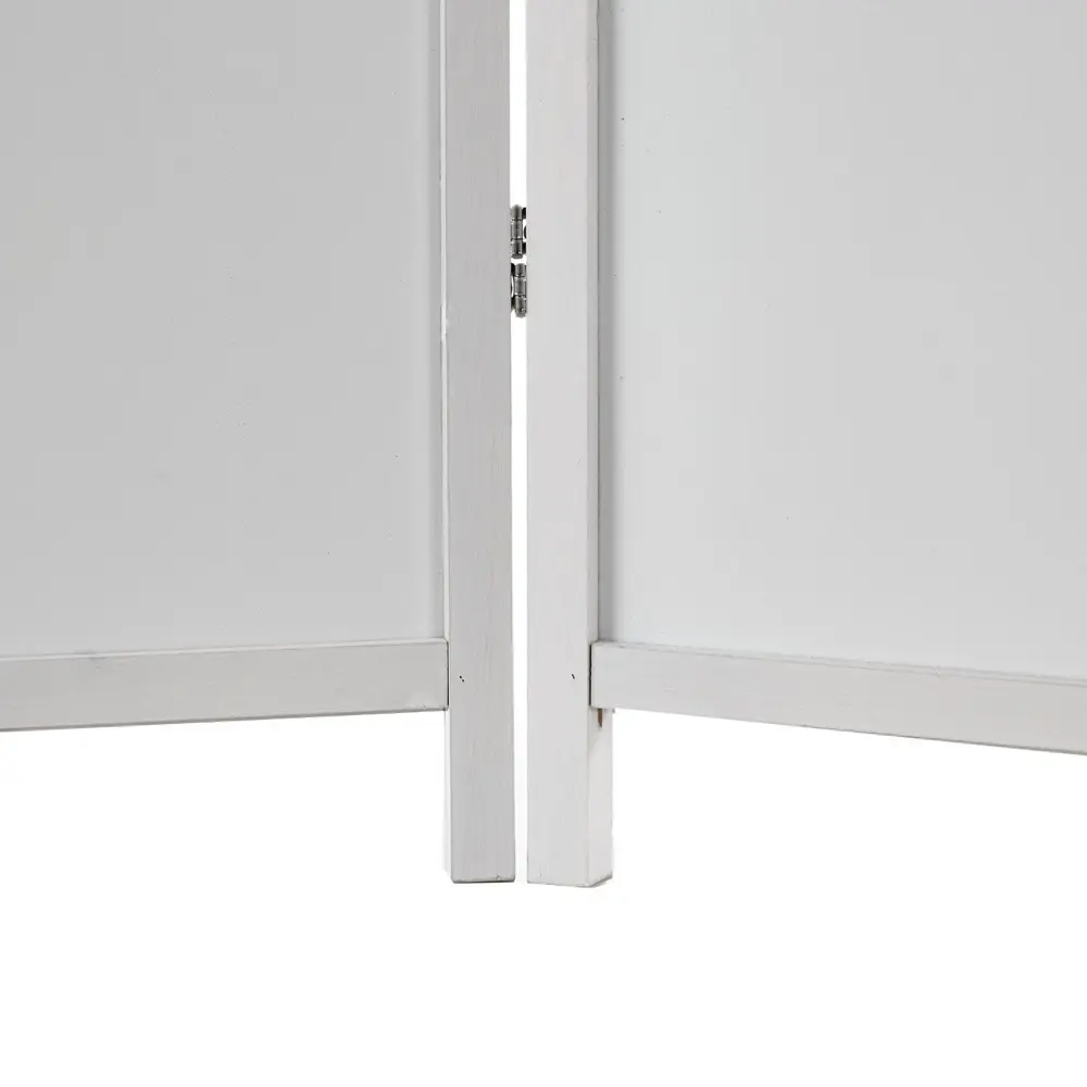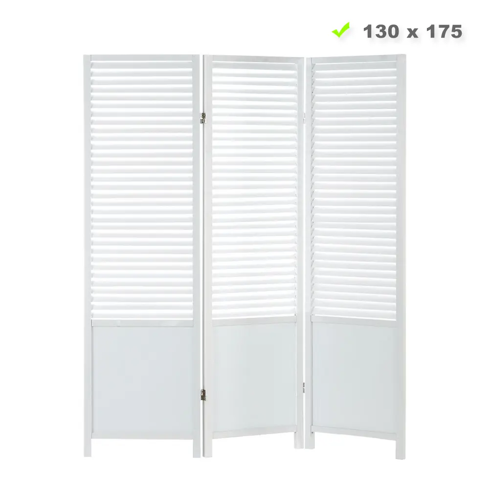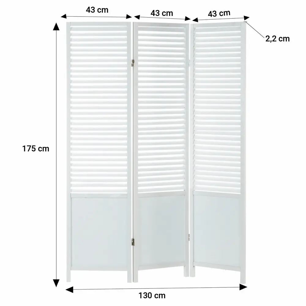 Der Paravent besteht aus drei verbundenen Elementen, mit jeweils 43 cm und ist für den Innenbereich konzipiert. Im oberen Bereich sind licht- und luftdurchlässige Holzlamellen integriert, die dem Raumteiler eine leichte, freundliche Optik verleihen. Der Paravent lässt sich im Handumdrehen aufstellen und benötigt keine zusätzliche Montage. Die beidseitig klappbaren Scharniere sorgen für maximale Flexibilität bei der Positionierung.