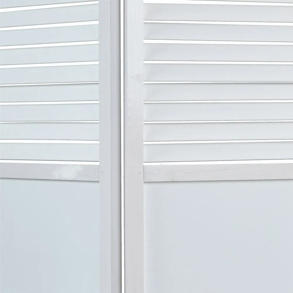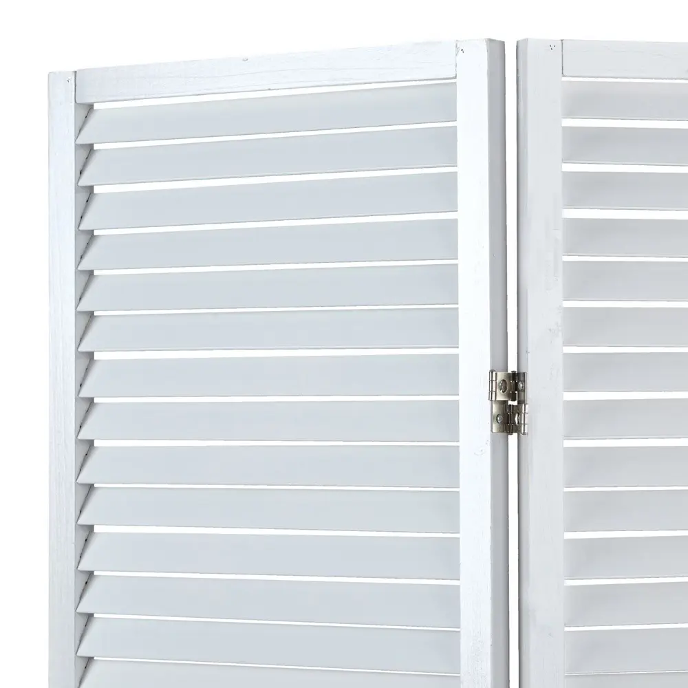 Der Holzrahmen des Paravents besteht aus stabilem Holz und ist in einem weißen Used-Look gestaltet. Die Lamellen im oberen Bereich sind aus Kiefernholz gefertigt und ebenfalls in Weiß gehalten. Die leicht durchscheinende Optik der Lamellen sorgt dafür, dass Licht und Luft sanft hindurchströmen können und schafft ein angenehmes Raumklima.