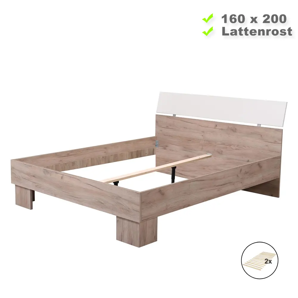 Das Doppelbett mit einer Liegefläche von 160×200 cm fügt sich dank seines dezenten und modernen Designs nahtlos in jeden Wohnraum ein. Die gut erkennbare Holzmaserung in grauer Eichenoptik verleiht dem Bettgestell eine natürliche und ansprechende Ästhetik, während das weiße Kopfteil einen harmonischen zusätzlichen Kontrast setzt.