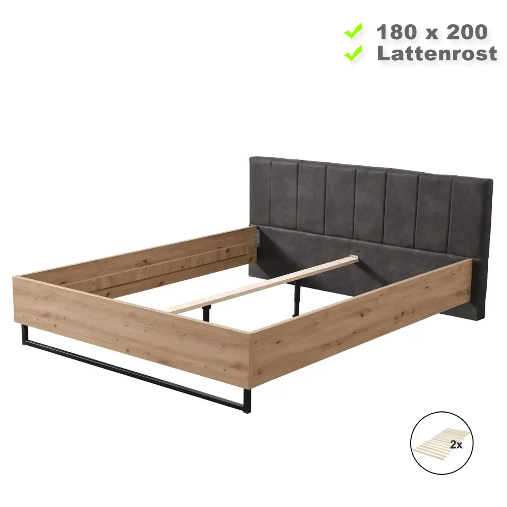 Das Bettgestell besteht aus stabilen HDF-Platten mit einer authentischen Optik in Artisan Eiche, wobei die natürliche Maserung des Holzes hervorsticht. Das Kopfteil ist mit hochwertigem PU-Schaumstoff gefertigt und mit einem stilvollen Stoffbezug in Anthrazit (Preston-96-Design) versehen. Die kufenförmigen Fußteile bestehen aus robustem Metall in Schwarz, was dem Bett einen industriellen Charakter verleiht. Das Bett hat eine Traglast von maximal 125 Kilogramm pro Seite, also insgesamt maximal 250 Kilogramm.