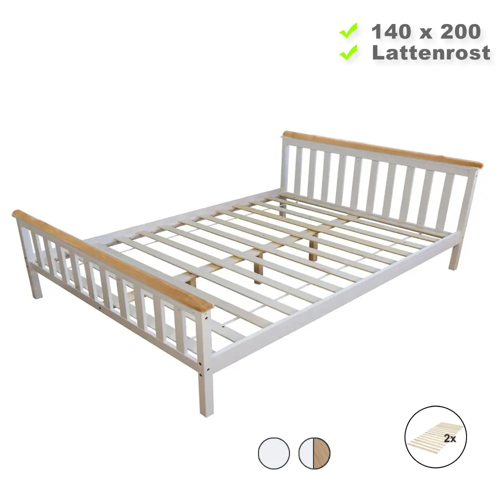 Erhältlich in Weiß mit naturfarbenem Akzent oder ausschließlich in Weiß – das lackierte Holz verleiht dem Massivholzbett 140×200 eine stilvolle Note. Zwei Lattenrollroste sind inklusive, jedoch können auch eigene Lattenroste verwendet werden. Das Bett präsentiert sich mit einem farblich abgestimmten Kopf- und Fußteil, entweder rein Weiß oder in Kombination mit einer naturfarbenen Zierleiste. Mit einer Höhe von 23 cm unter dem Doppelbett bietet es zusätzlichen Stauraum.