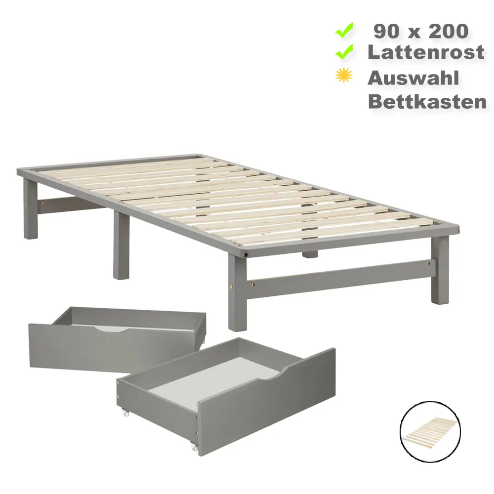 Massivholzbett 90×200 – Palettenbett ohne Kopfteil – Auswahl Bettkästen – Farbe: Grau