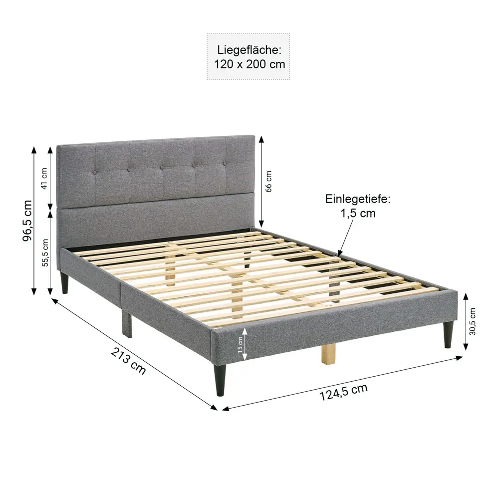 Schickes standfestes Polsterbett mit einer Liegefläche von 120×200 cm – ein zeitloses Doppelbett mit einem höheren Kopfteil. Ein Lattenrost ist inklusive und eine extra Mittelstrebe sorgt für weitere Stabilität. Farblich in einem dezenten Grau.