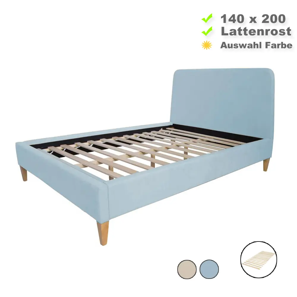 Farbiges, schickes und stabiles Polsterbett in dem Flächenmaß 140×200 cm – ein trendiges, massives Doppelbett mit einem hohen Kopfteil. Inklusive ist auch ein Lattenrollrost. Farblich in der Auswahl zwischen einem modernen Hellblau und einem eleganten Beigeton.