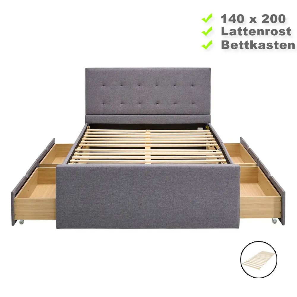 Polsterbett 140 × 200 mit vier Bettkästen:
