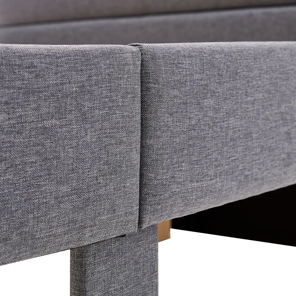 Das Polsterbett 140 × 200 cm verfügt über einen robusten Polyesterstoffbezug in Grau, der eine qualitative Webstruktur hat und dem Bett eine Besonderheit gibt. Darüber hinaus profitieren Sie bei diesem Doppelbett von vier großzügigen Bettkästen, in denen Sie Bettwäsche, Dekoration und mehr verstauen können. Die Rückseite des Kopfteils ist mit einem schwarzen Polyester-Vlies versehen.