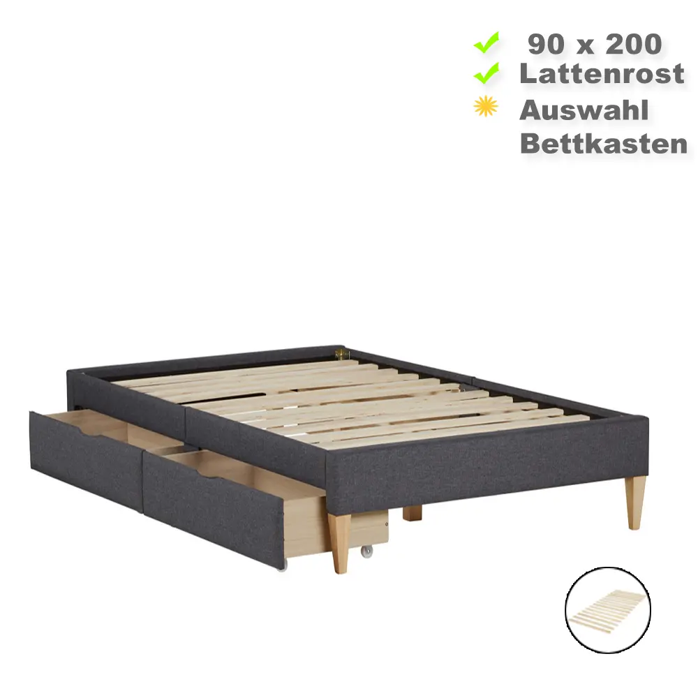 Polsterbett 90×200 in Grau – Einzelbett mit Hartholzfüßen, optional mit Bettkästen