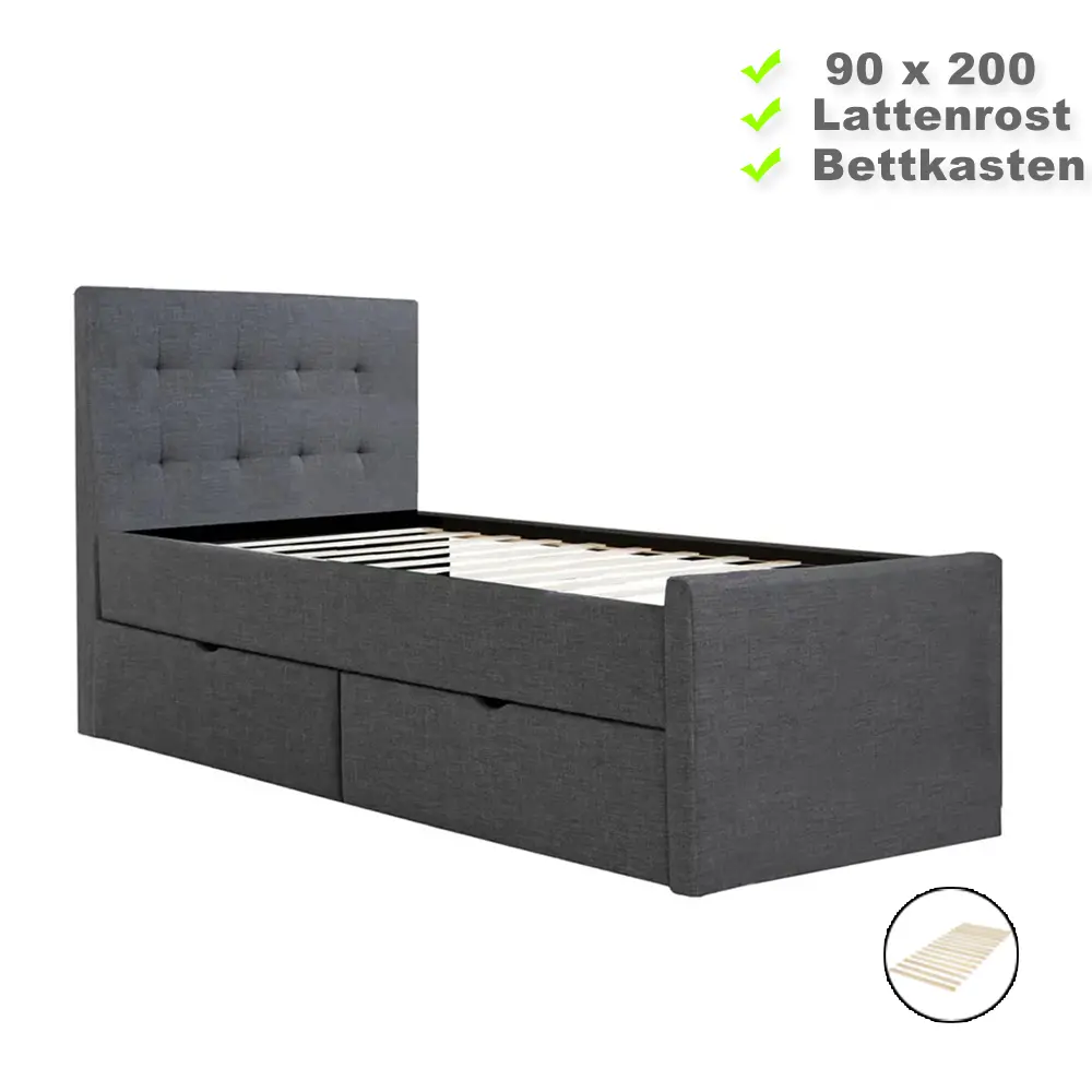 Modisches, standfestes Polsterbett in dem Maß 90×200 cm – ein edles Einzelbett, inklusive Lattenrost und mit zwei Bettkästen. Farblich in einem eleganten Grau, Anthrazit.