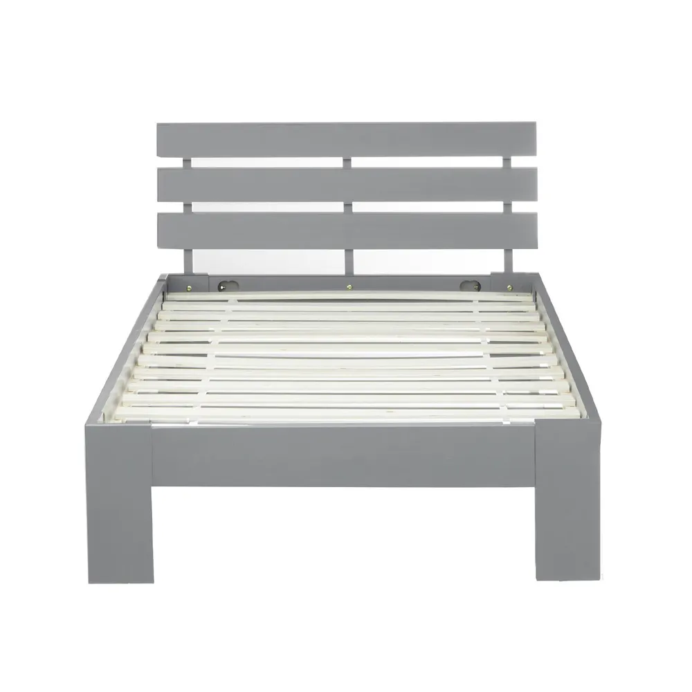 Massivholzbett in Grau, 90 x 200 cm, Einzelbett mit Lattenrost aus Kiefernholz, mit Kopflehne. Ausstellungsbett wieder Neu im Karton eingepackt, mit einem Neuen Satz Schrauben. Die Verpackung wurde getauscht. Wir geben auch auf Ausstellungsbetten volle 2 Jahre Garantie.