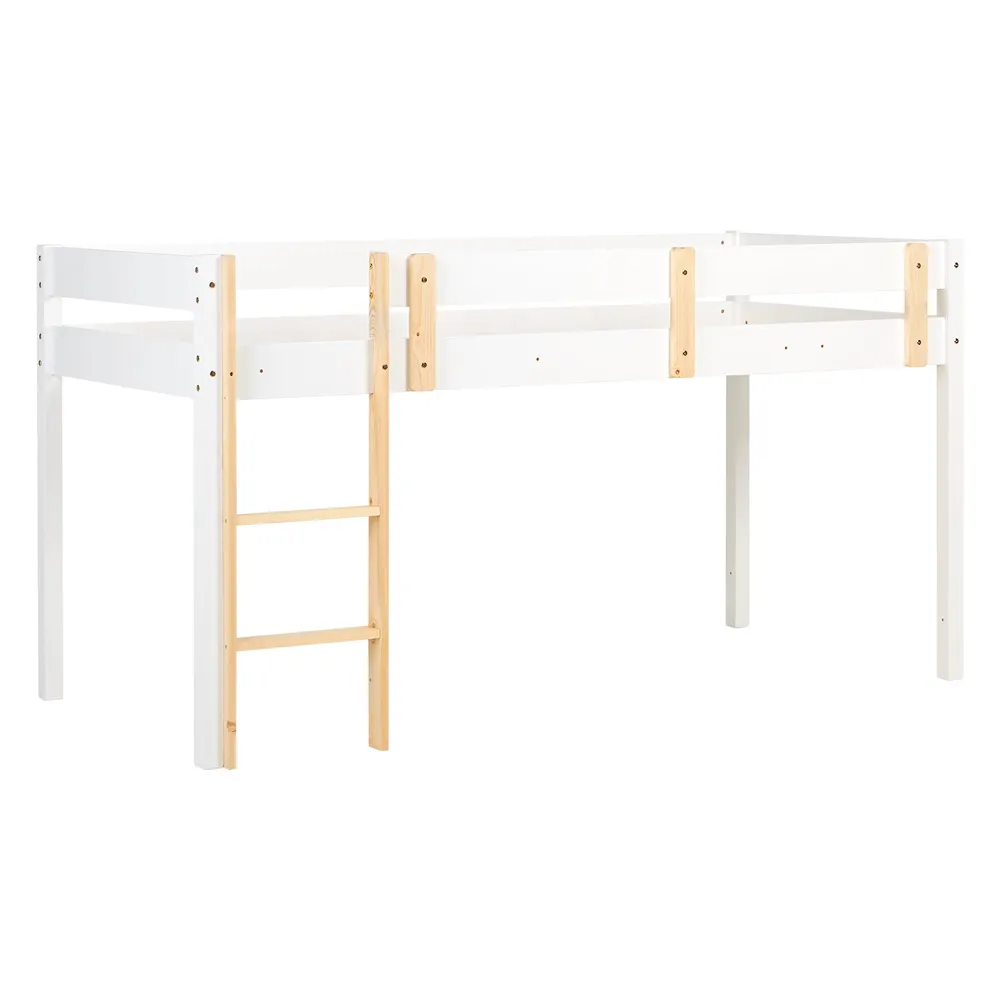 Kinderbett 90 x 200 cm – Hochbett aus Kiefernholz in Weiß mit naturfarbener Leiter – Retourware