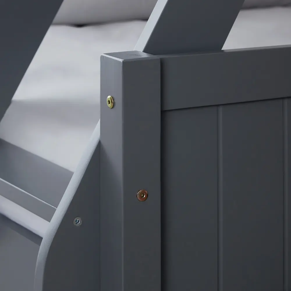 Neue Geprüfte Retourware – ein Doppelstockbett mit zwei Liegeflächen, einmal 90 x 200 cm und einmal 140 x 200 cm. Ein Etagenbett mit Lattenrosten aus Kiefernholz. Farblich grau lackiert. Die Verpackung wurde getauscht.