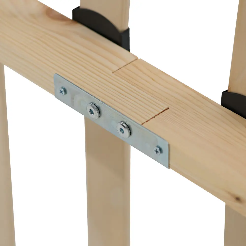 Verwendet wird massives Kiefernholz mit sichtbar natürlicher Maserung, die dem Produkt einen authentischen Charakter verleiht. Die Leisten sind aus furniertem Schichtholz gefertigt, ergänzt durch robuste Einschubkappen aus schwarzem Kunststoff. Die naturbelassene Holzfarbe trägt zu einem behaglichen und wohnlichen Ambiente im Schlafbereich bei.