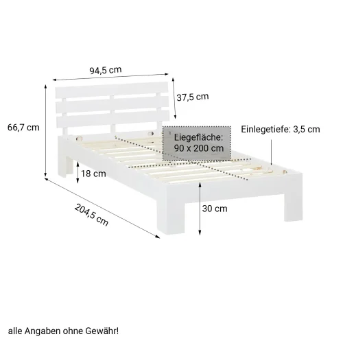 Ausstellungsbett – Massivholzbett 90×200 cm – Einzelbett Weiß extra Stützfüße